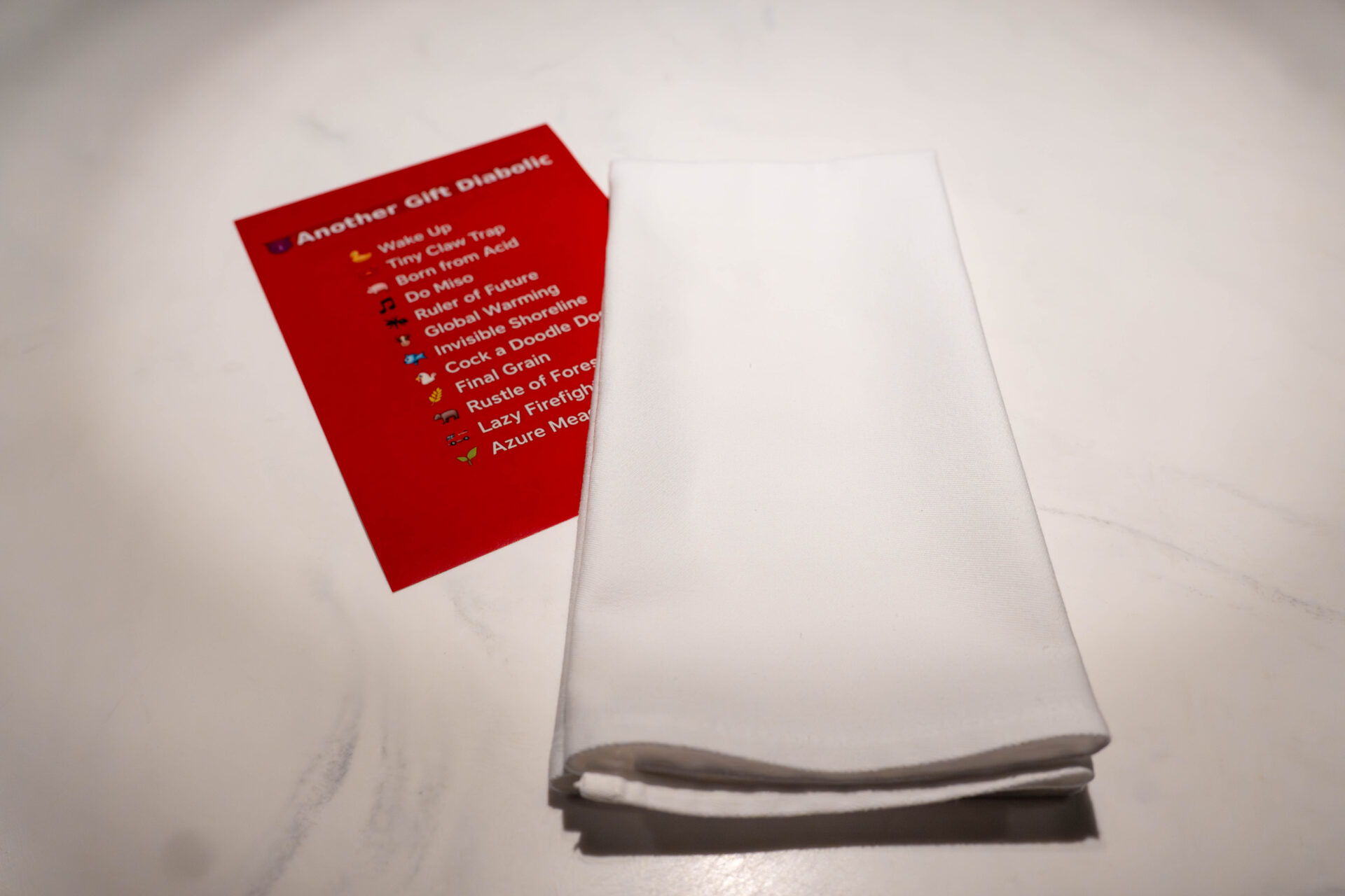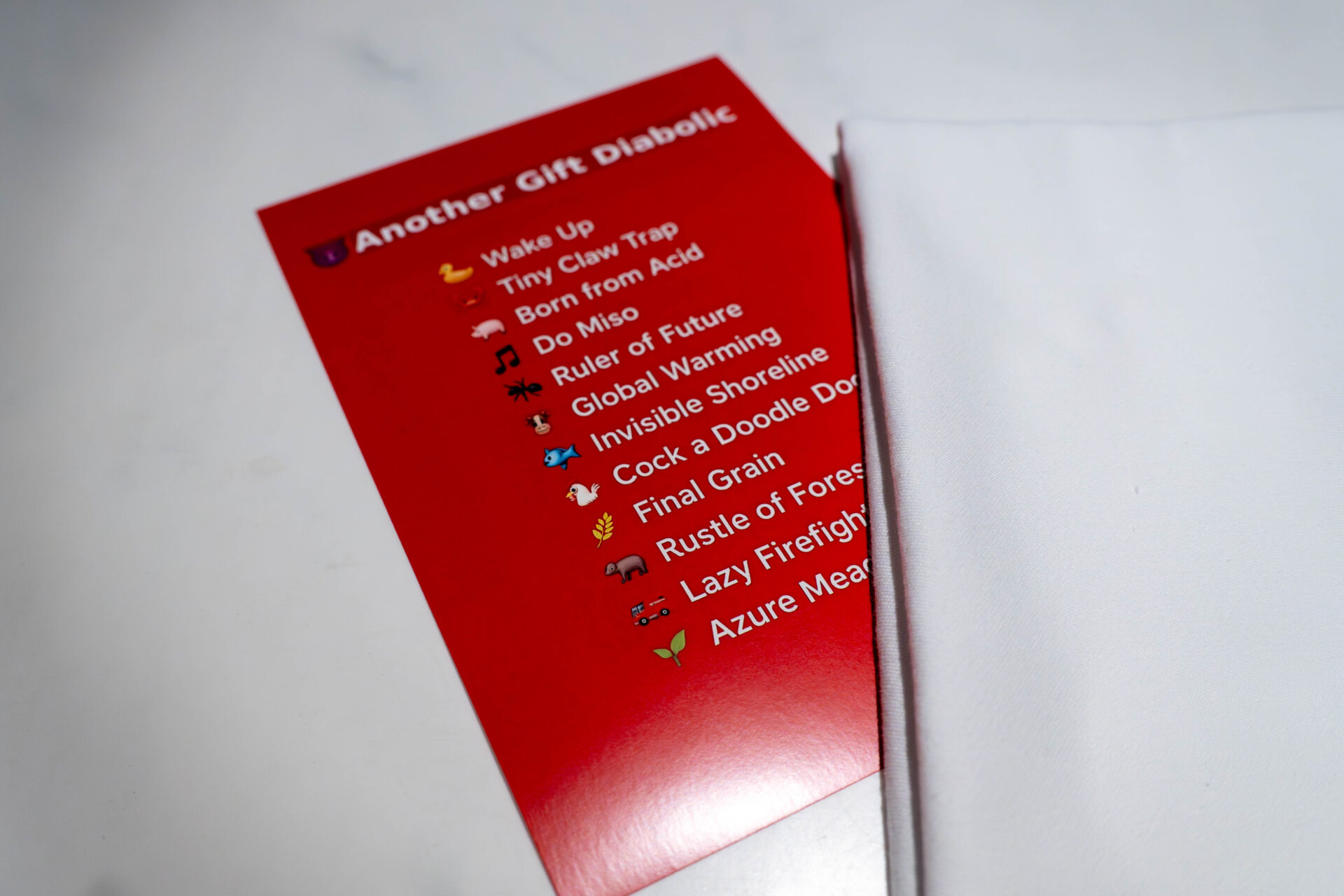 On the table is a vivid red card. Instead of dish names, it lists phrases that resemble song titles.