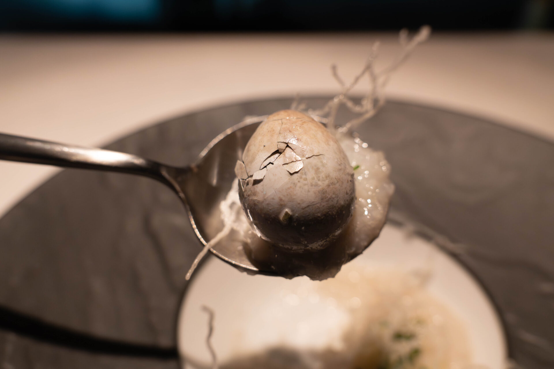 At the center was a quail century egg, served boldly to be eaten shell and all, releasing a unique savoriness and aroma. Around it, fried sen mee noodles were arranged like a bird’s nest, evoking the imagery of morning.