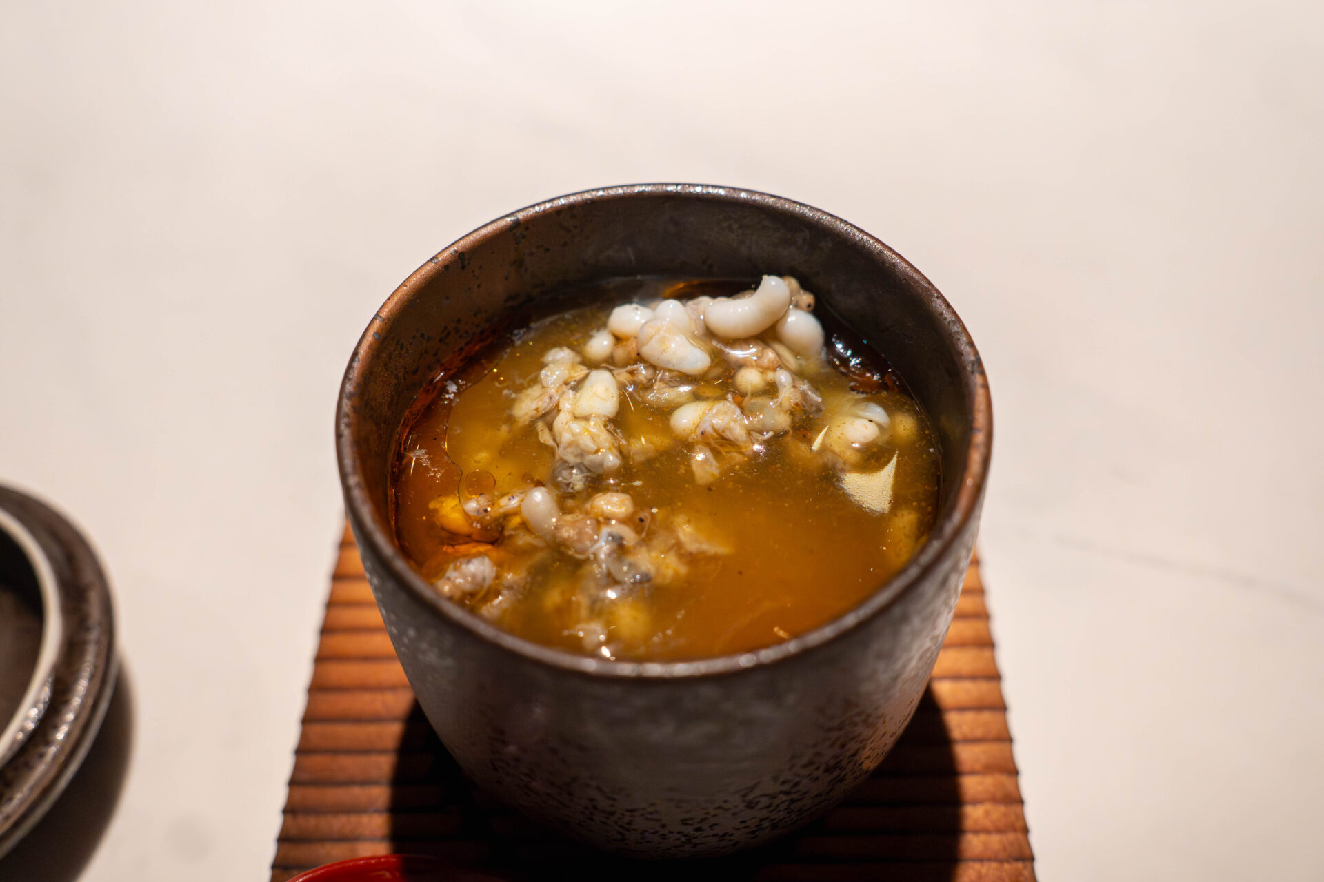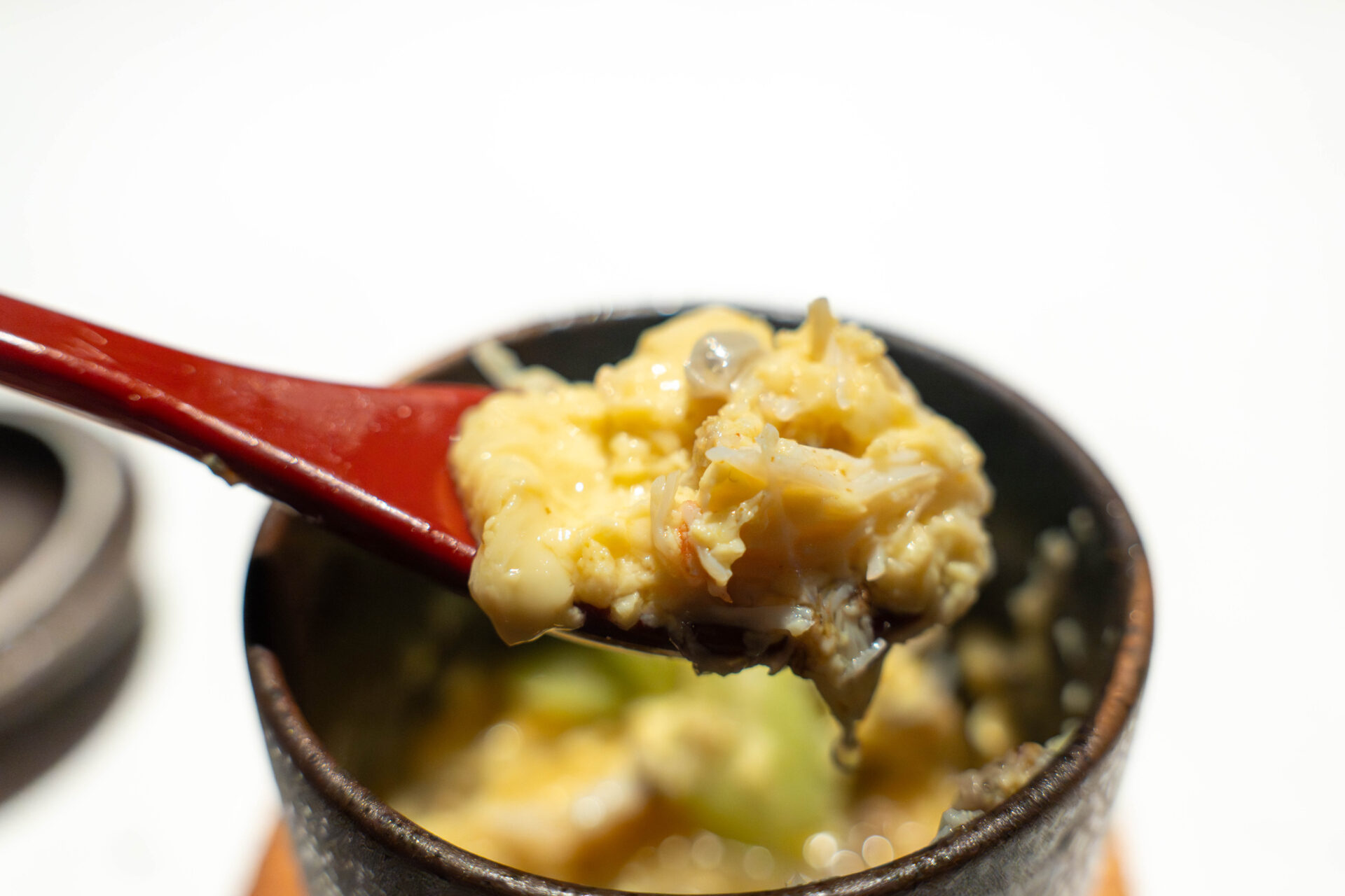 The base drew inspiration from pu pad pong curry. The umami of crab was joined by Isan weaving ants and their eggs, adding acidity, aroma, and the popping texture of the eggs. Smooth chawanmushi combined with spice heat and the distinctive flavor of ants, evoking unfamiliar sensations with every bite.
