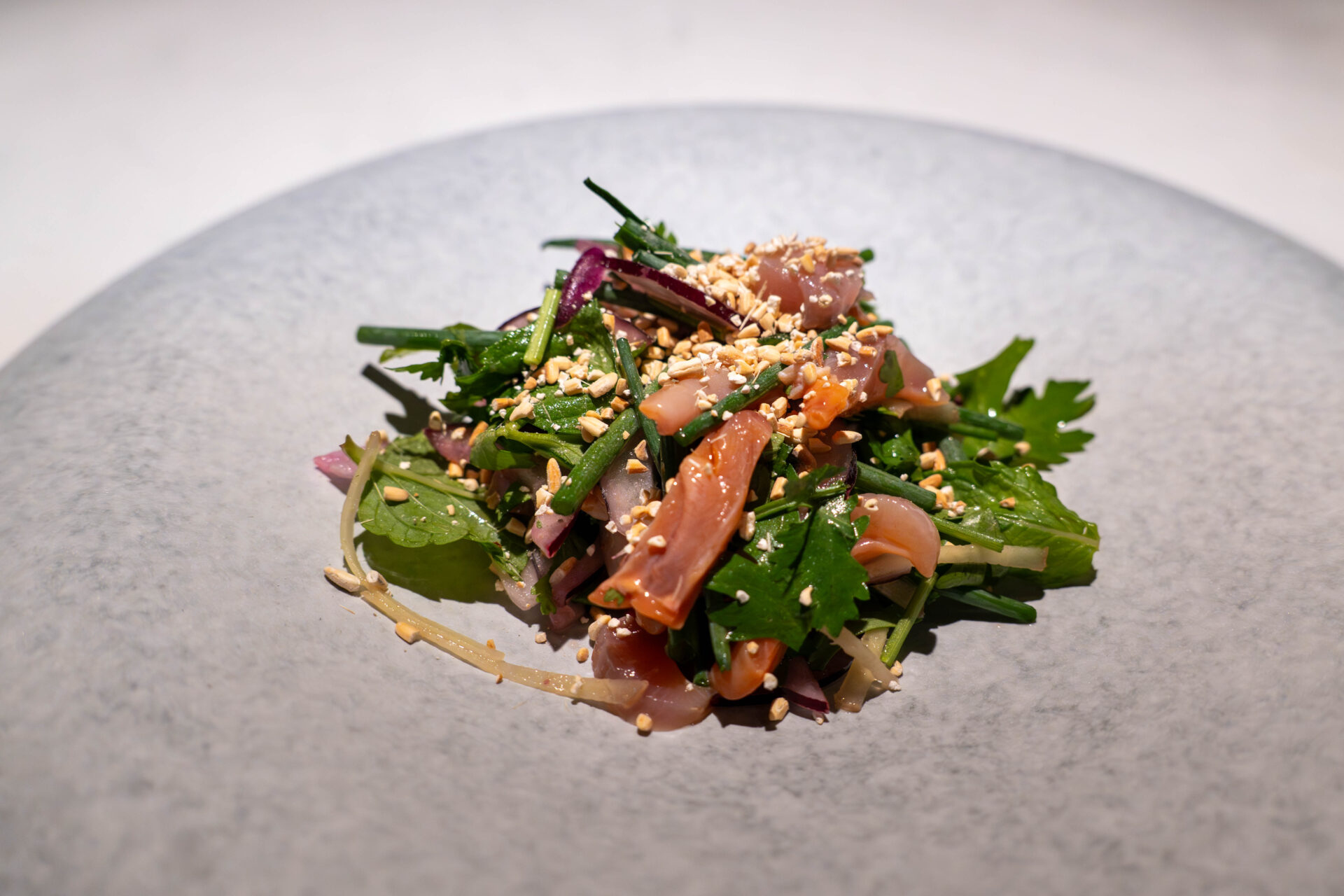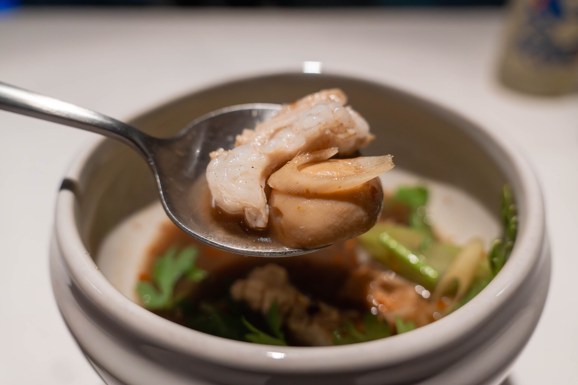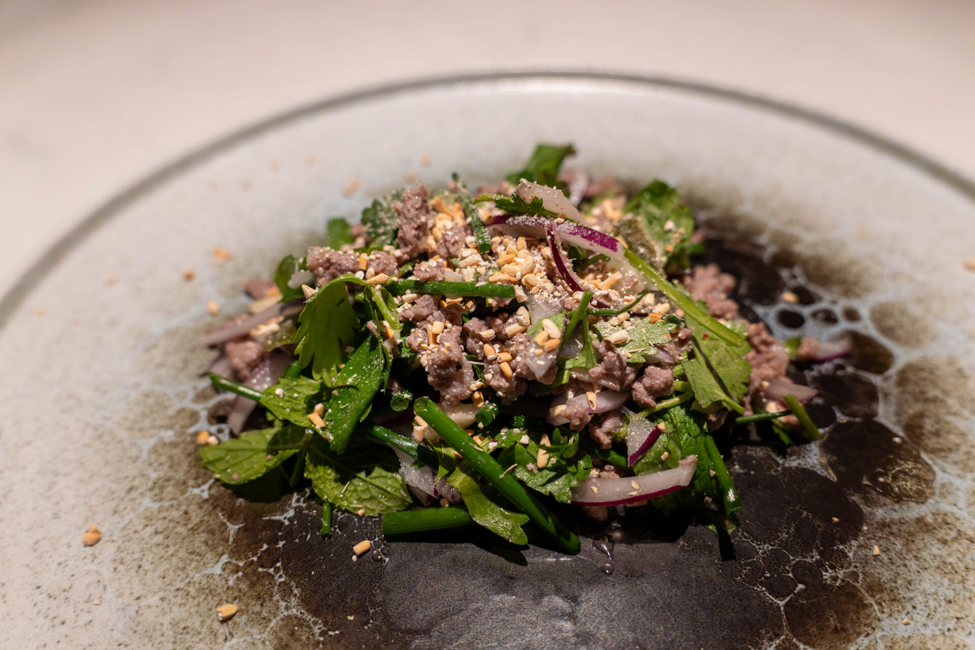 Ark shell was combined with red onion and cilantro, finished with toasted rice powder (khao khua) for aroma, creating a salad style. The fresh texture of the shellfish combined with herbs’ brightness and spices’ kick for a light yet layered taste.