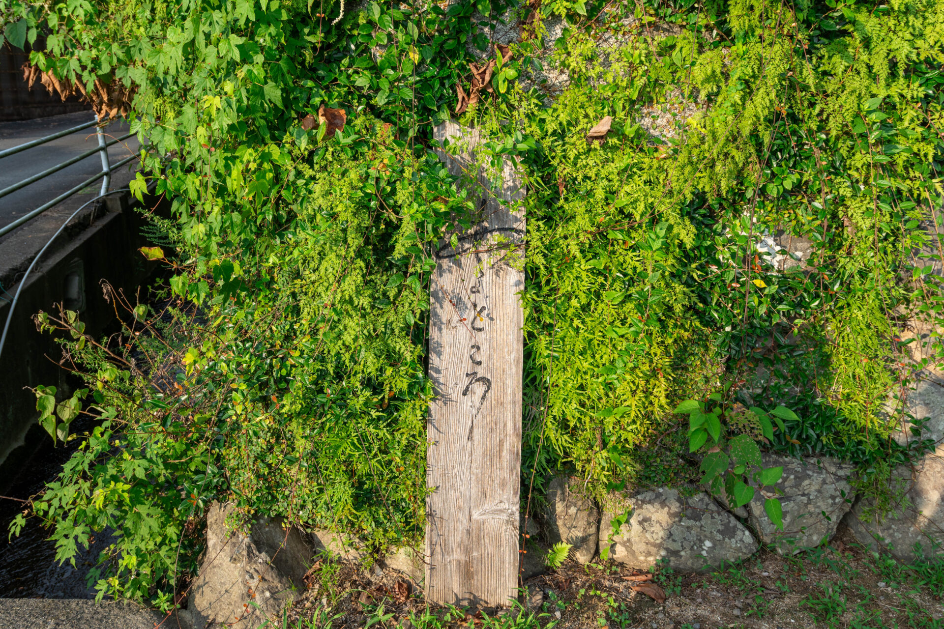 A simple wooden sign bearing only the words “Aru Tokoro” stands by the overgrown path, inviting visitors into the opening scene of an old folktale.