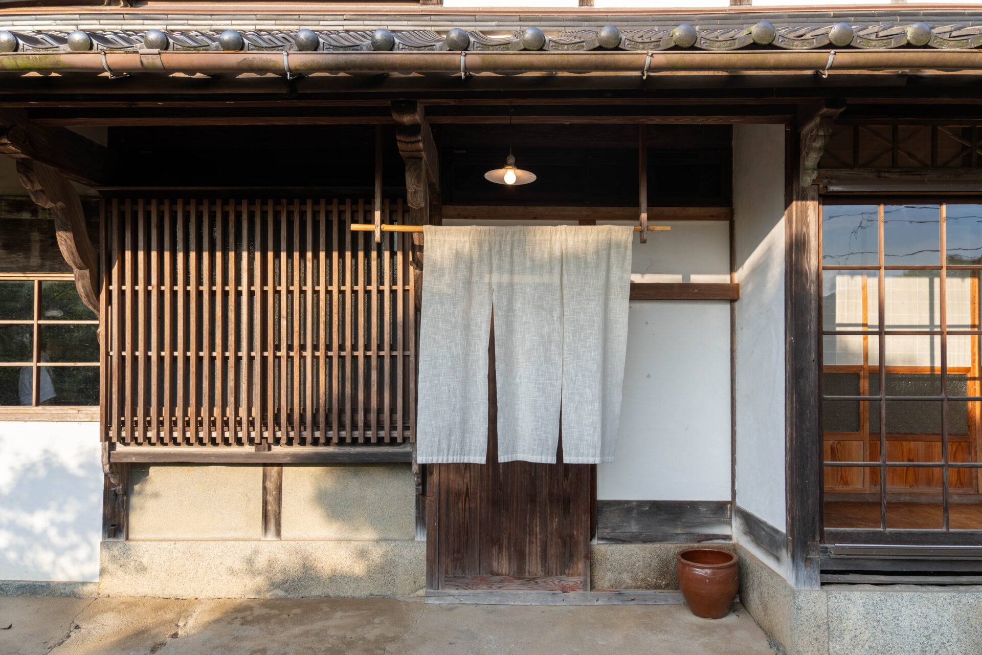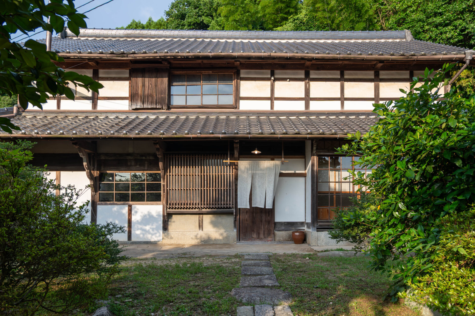 Beyond the path, guests are welcomed by the main building with its lattice windows and a white noren curtain at the entrance.