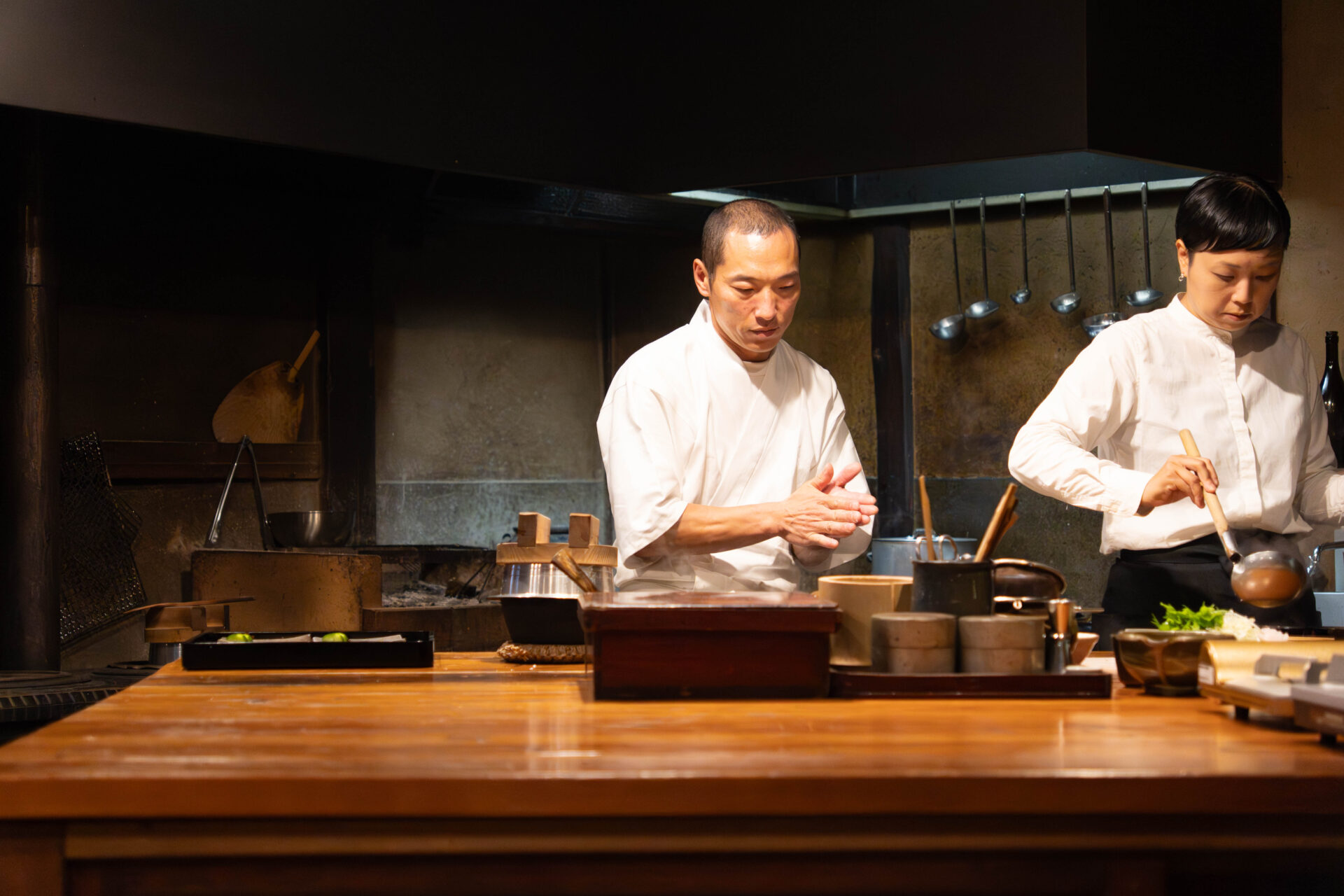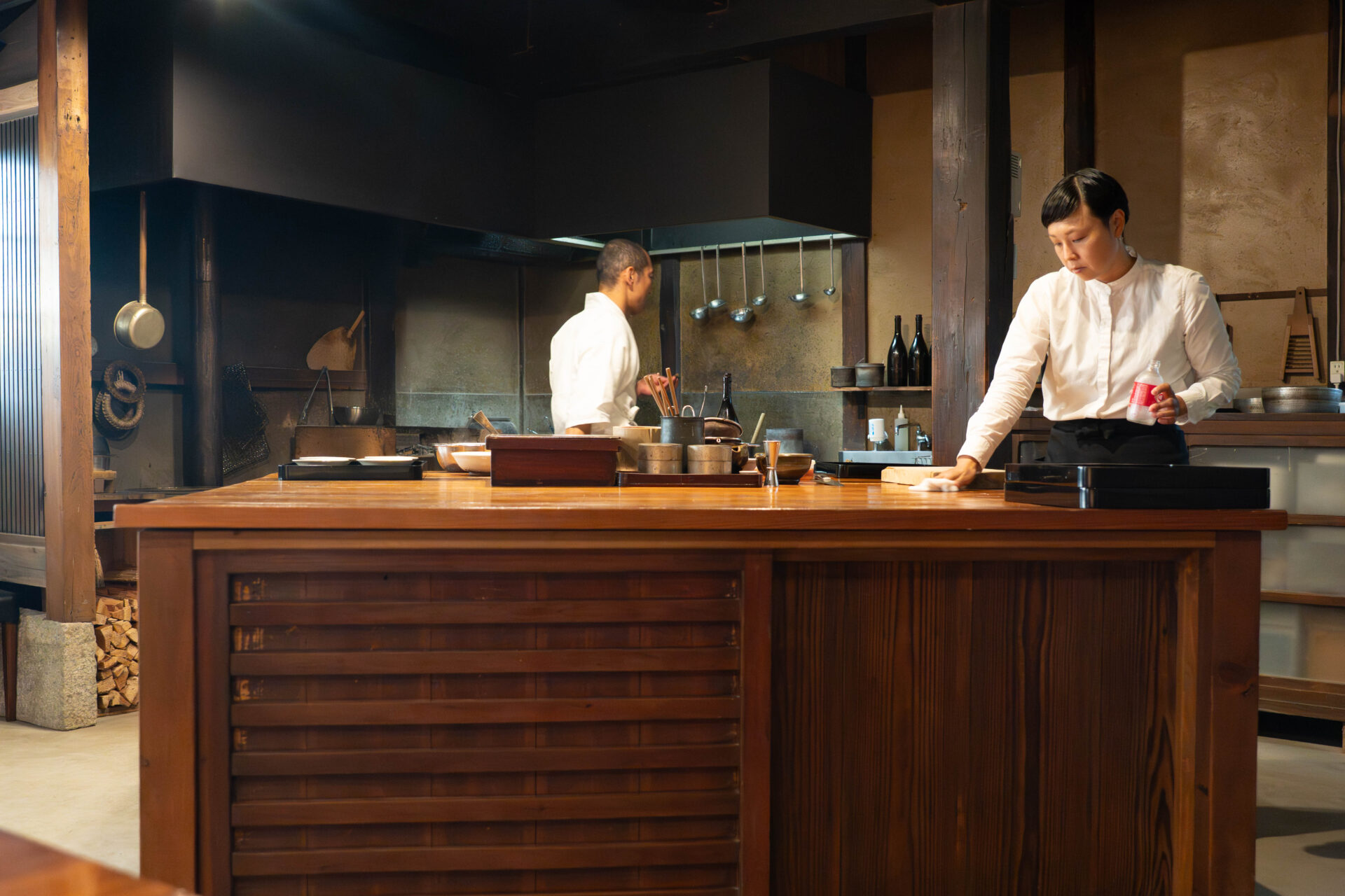 Earthen walls, a traditional kamado stove, and bamboo crafts create a warm, handcrafted atmosphere, offering a nostalgic yet serene environment in which to engage with the cuisine.