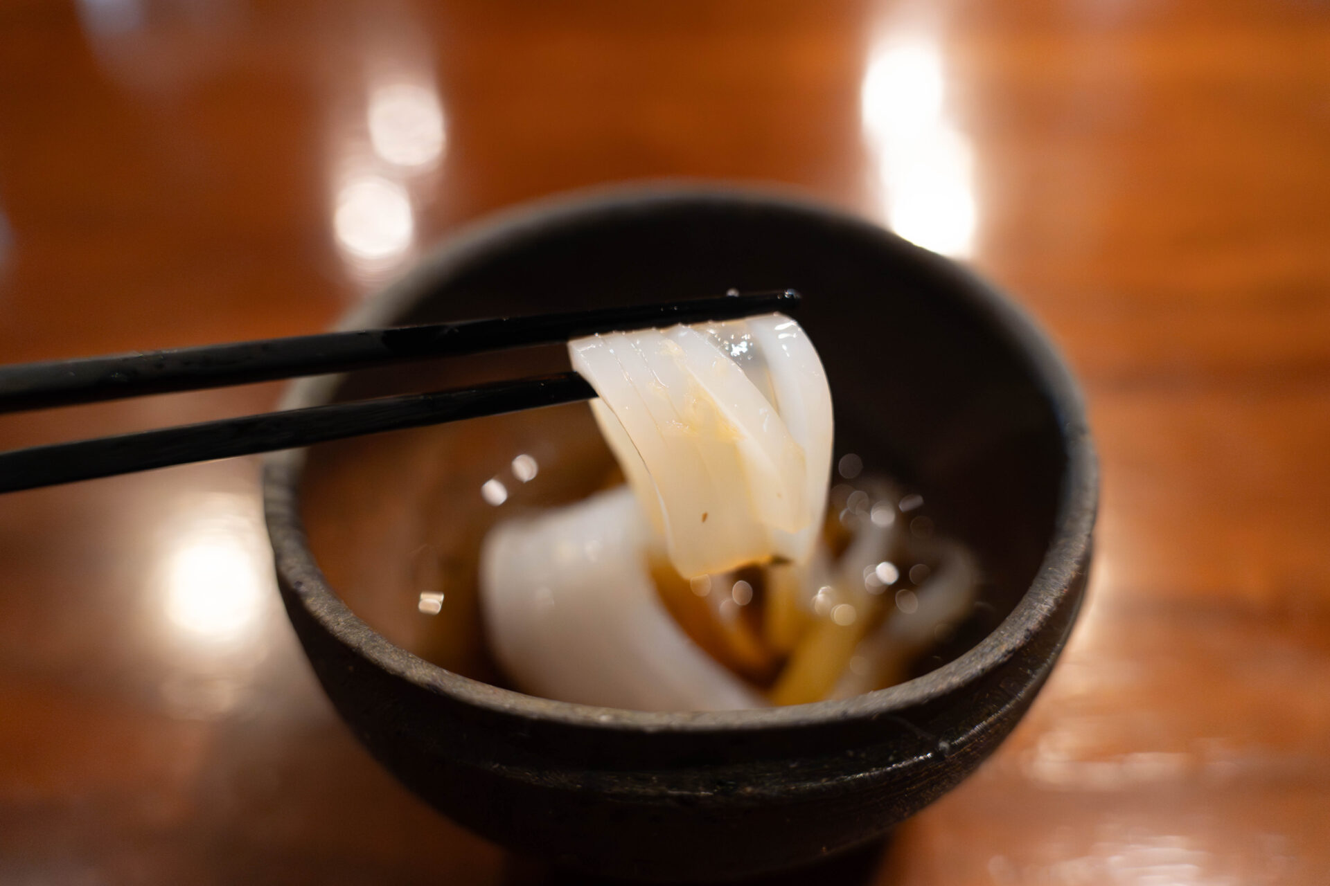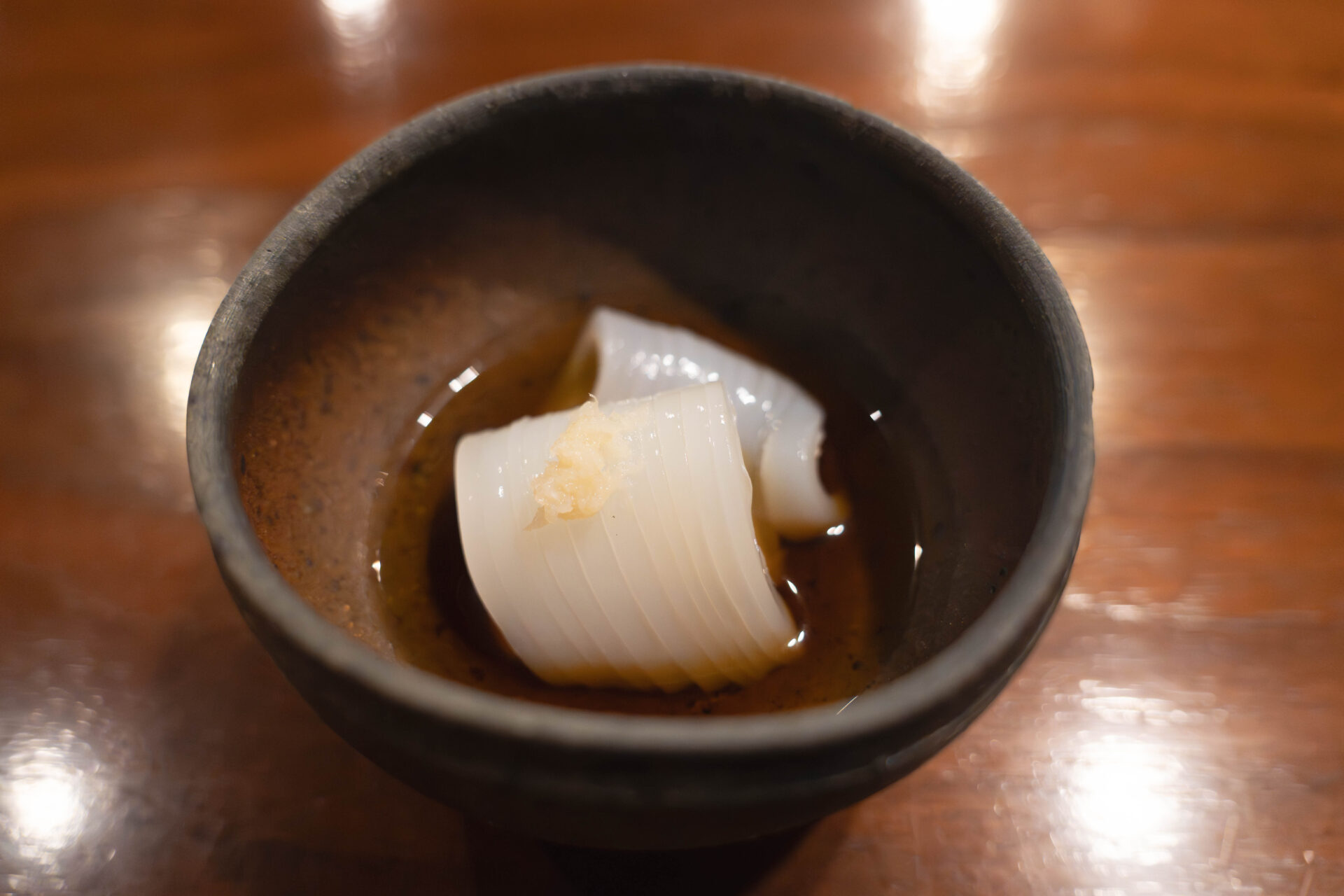Served chilled in light dashi and paired with fresh ginger, which enhances the squid’s delicate flavor.