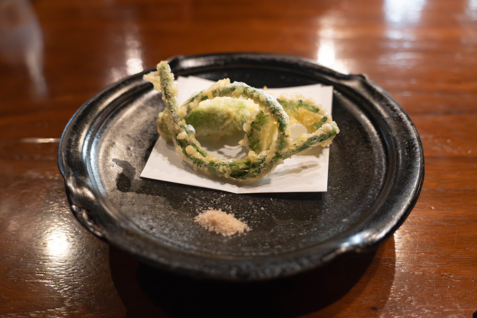 A trio of summer vegetables — island okra, bitter melon, and sasage beans — were lightly fried into crisp tempura.