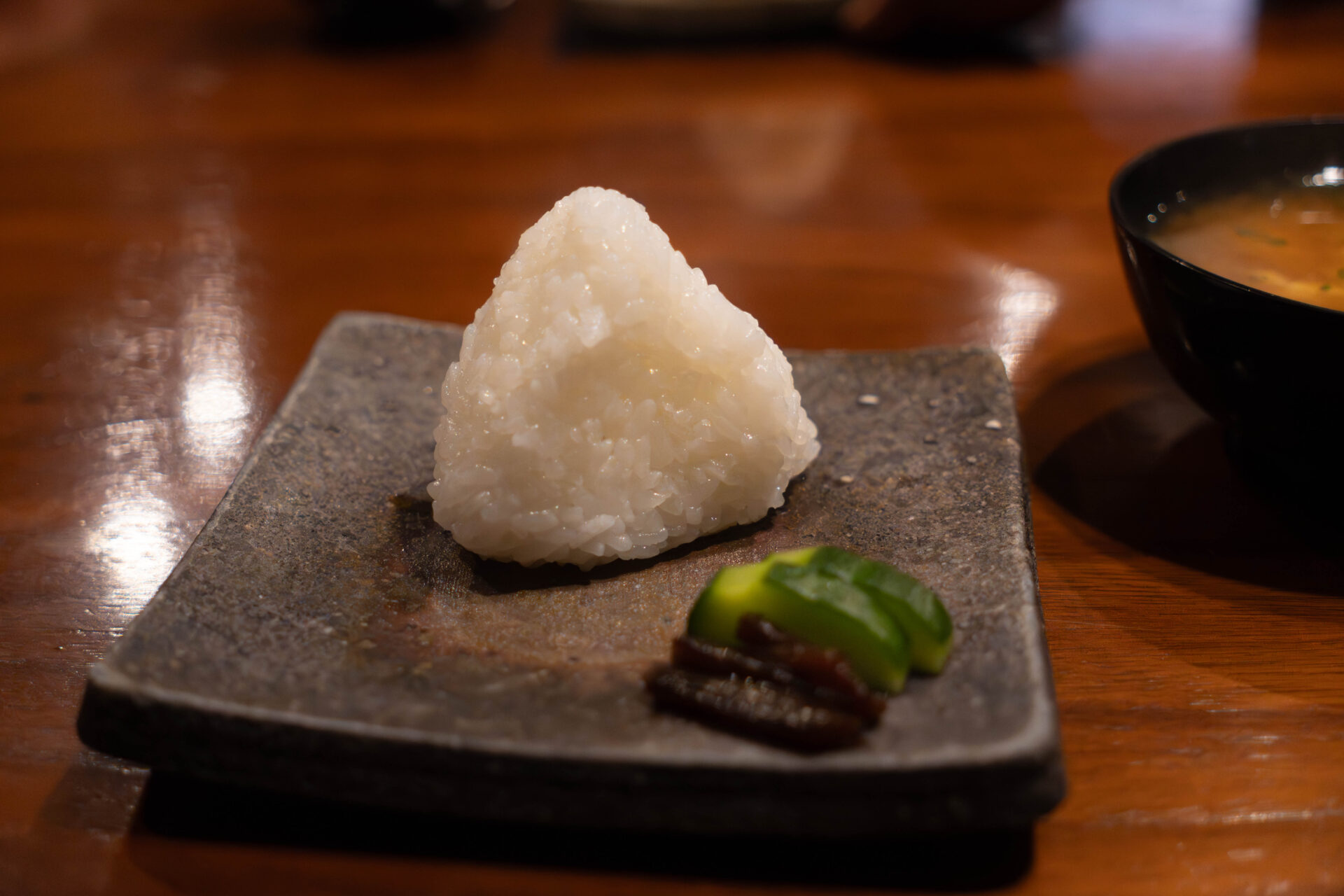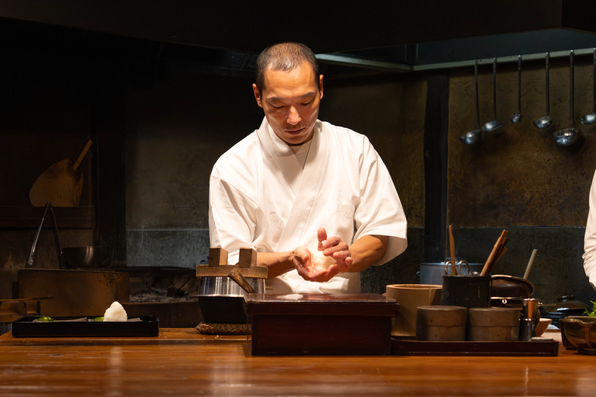 For the finale came the long-awaited onigiri — rice balls shaped by the chef’s hands from freshly cooked, steaming rice straight from the kamado stove.