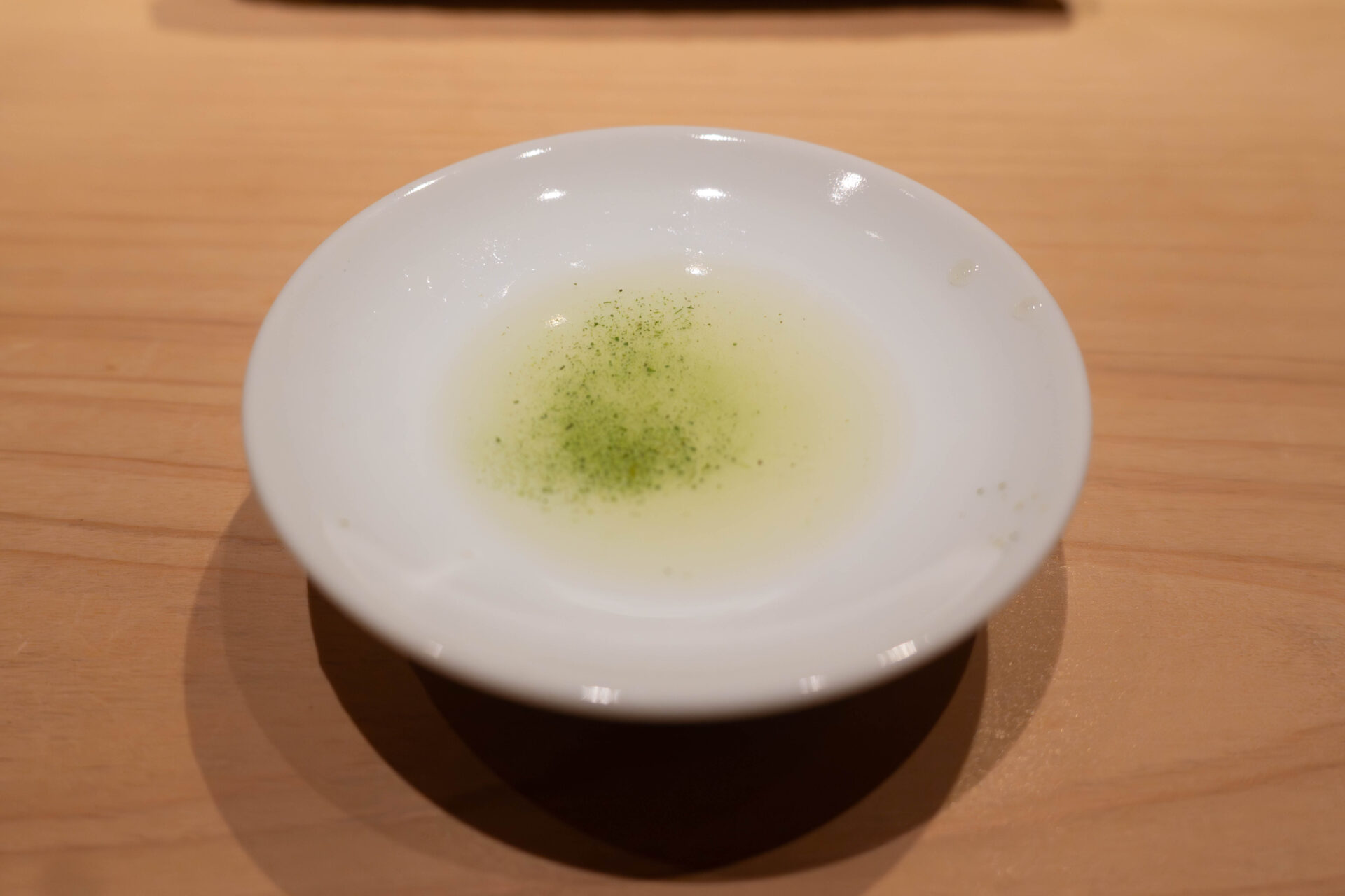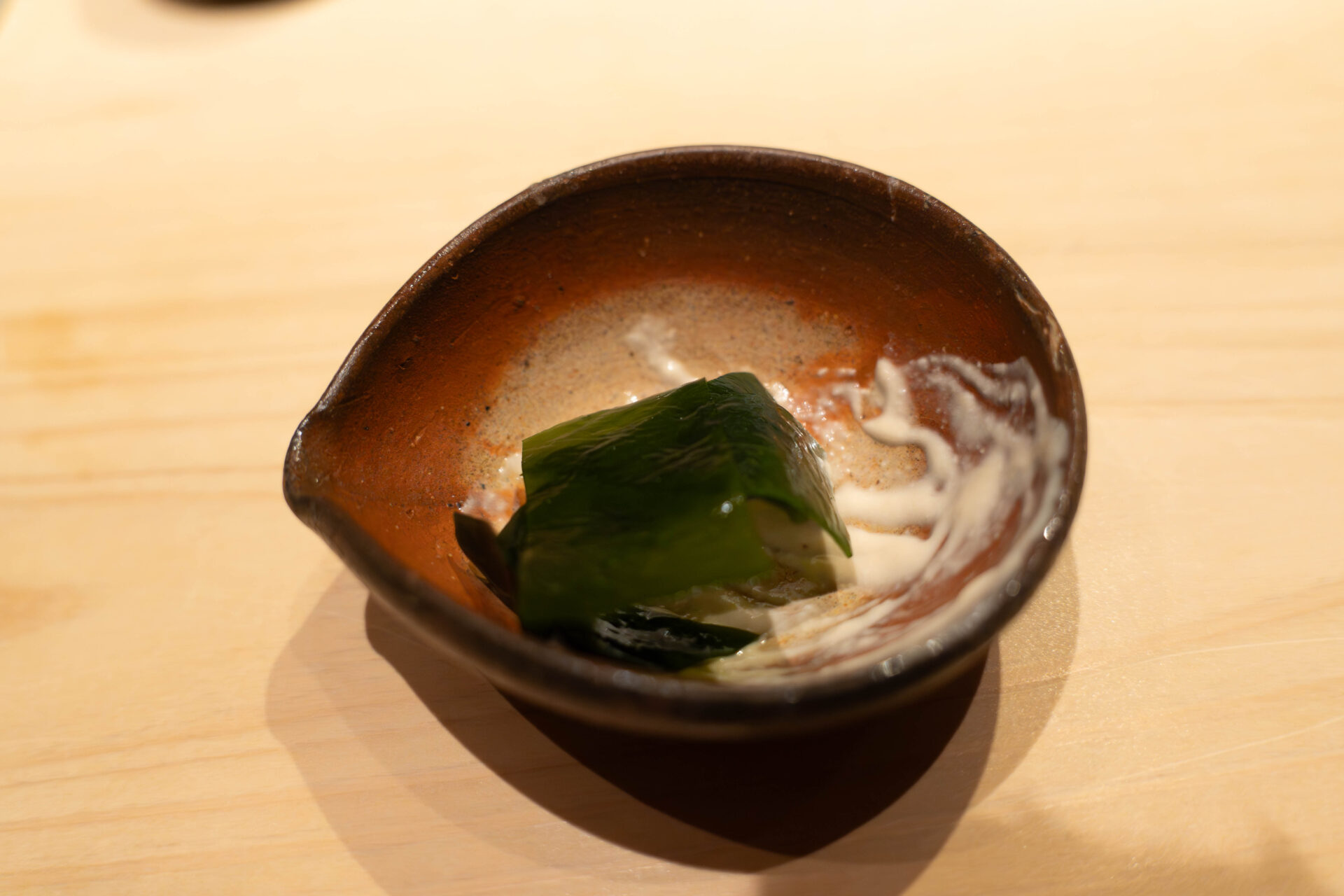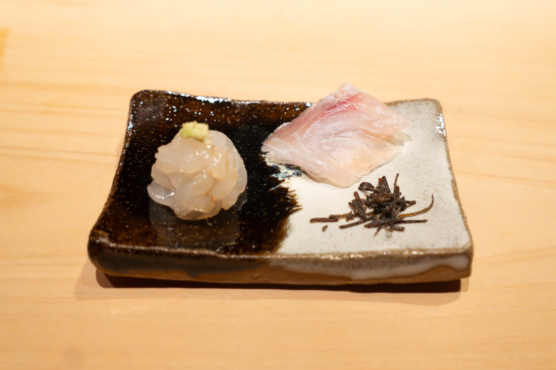 On the right, slices of grunt (isaki) paired with salted kelp. This simple combination enhanced the fish’s natural sweetness with the umami of the seaweed and a delicate aroma of the ocean.
