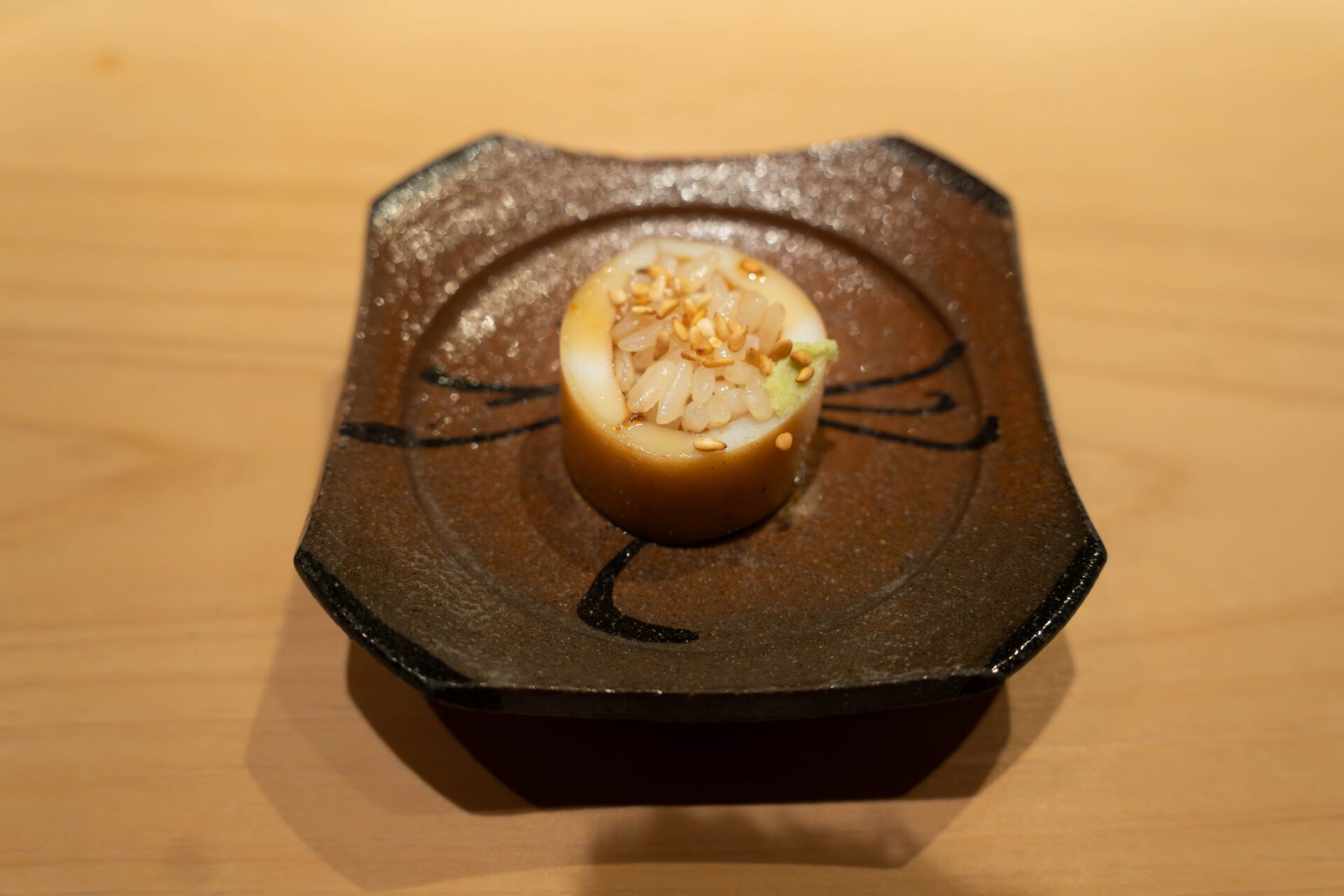 Softly prepared squid was filled with sushi rice, topped with sesame and a hint of wasabi. Each bite revealed the sweetness of the squid, the gentle acidity of the rice, and the nutty fragrance of sesame.