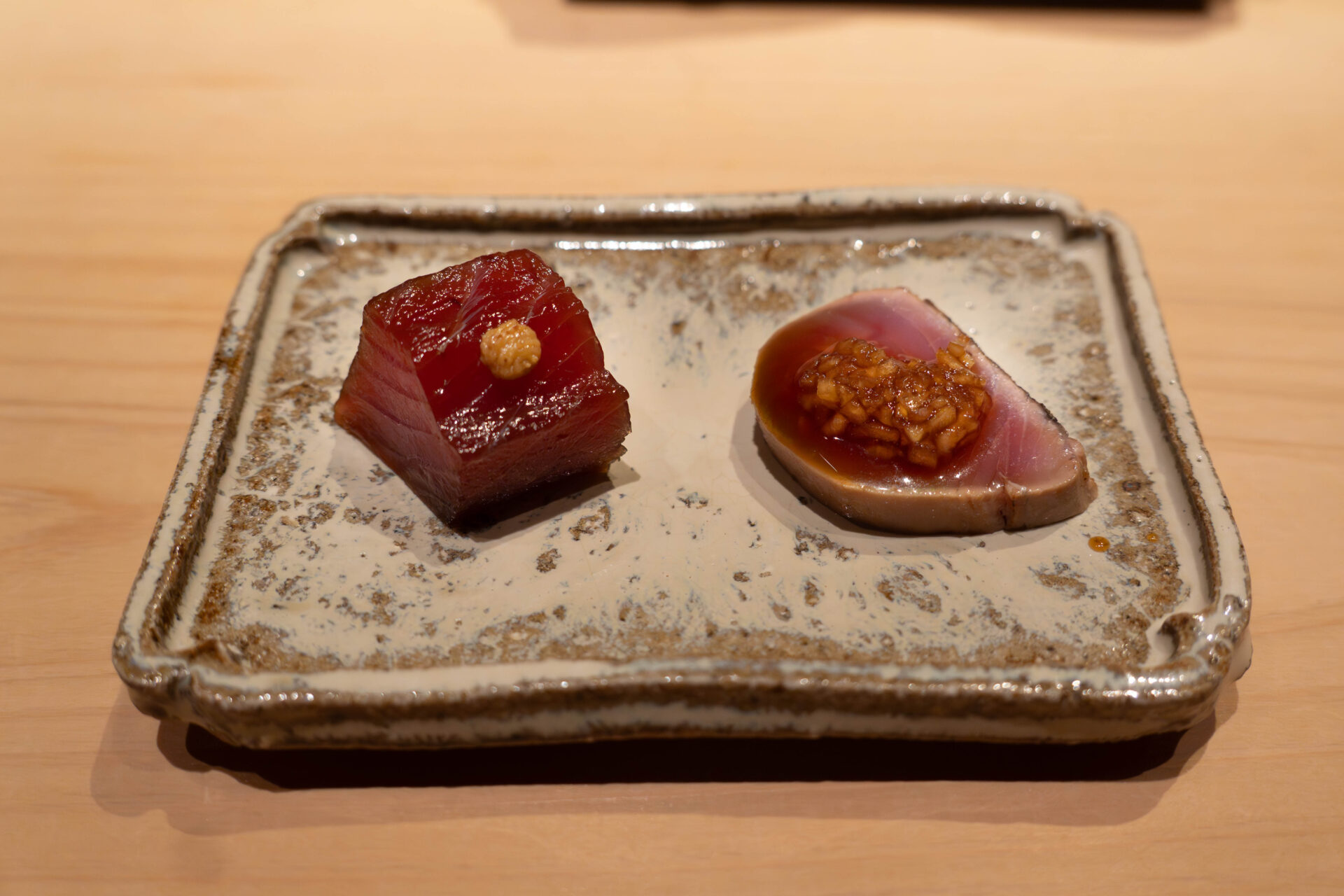 On the left: marinated bonito—moist, glossy, and accented with the brightness of karashi mustard.