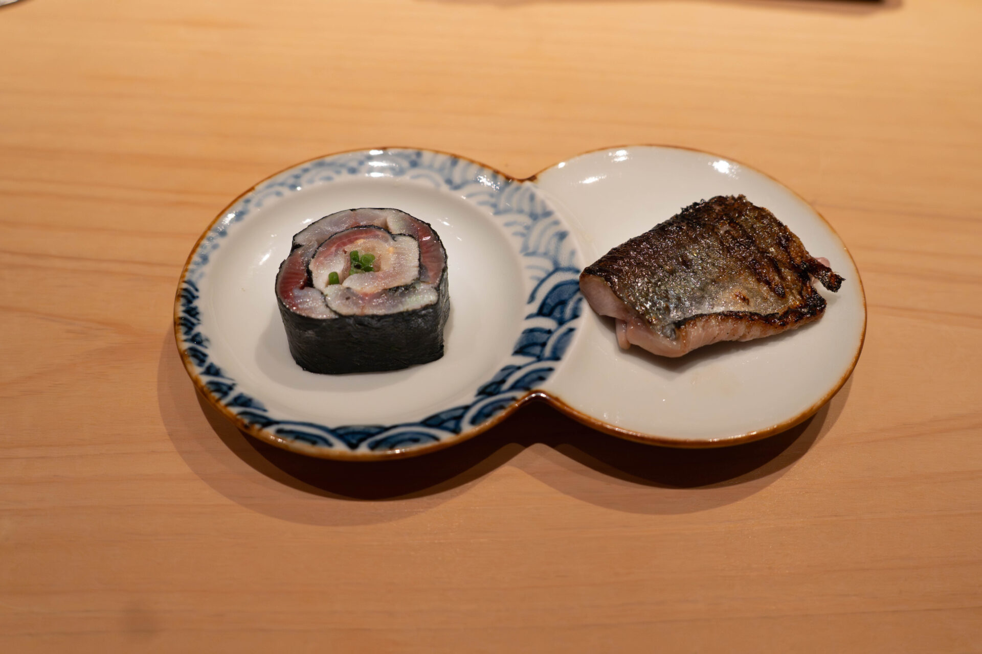 On the left: sardine roll wrapped in nori, where the fatty richness was balanced by refreshing herbs.
