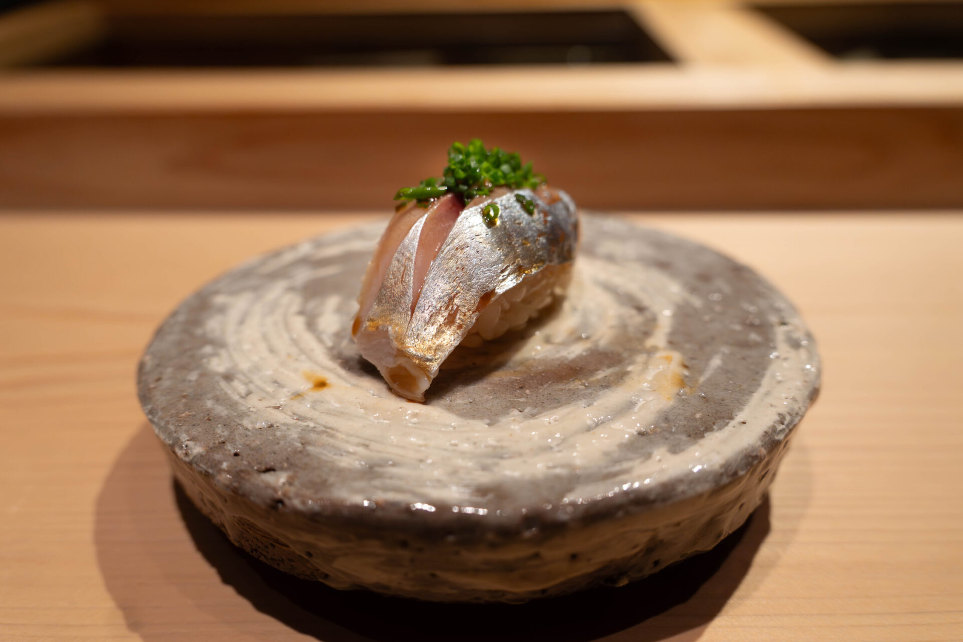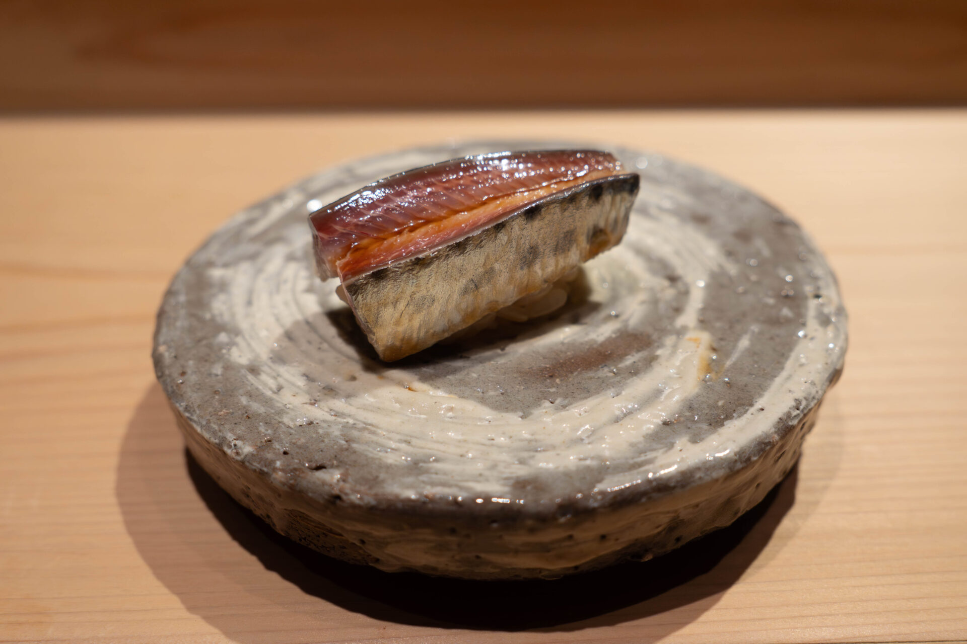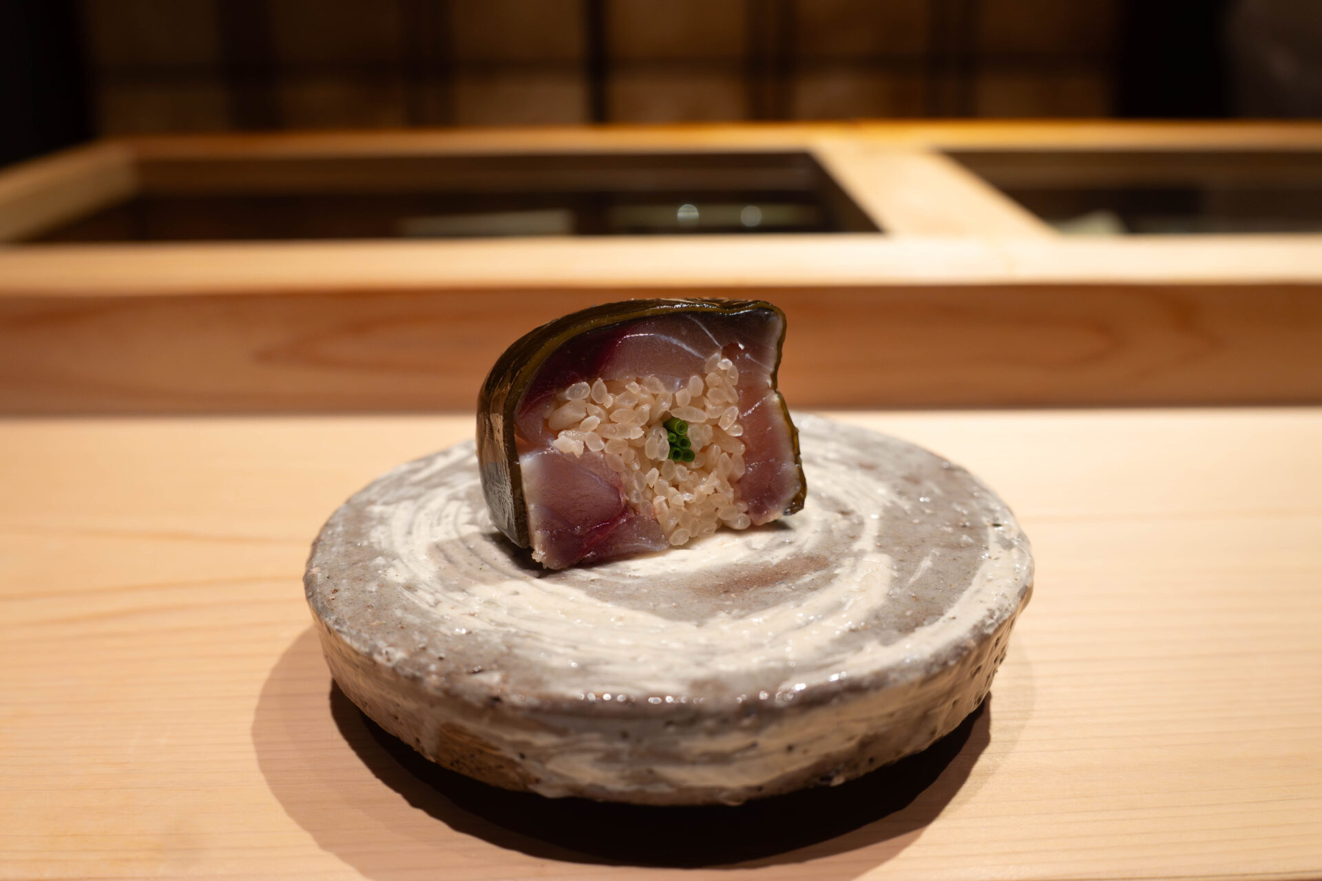 Fatty, glistening mackerel was wrapped in kelp and paired with shari seasoned with akazu. A touch of green herbs at the center added brightness to the rich umami.