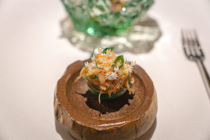 皿の下にはとうもろこしのピュレが敷かれ、最後に酢橘を絞って香りを添えることで、味わいに立体感が生まれます。