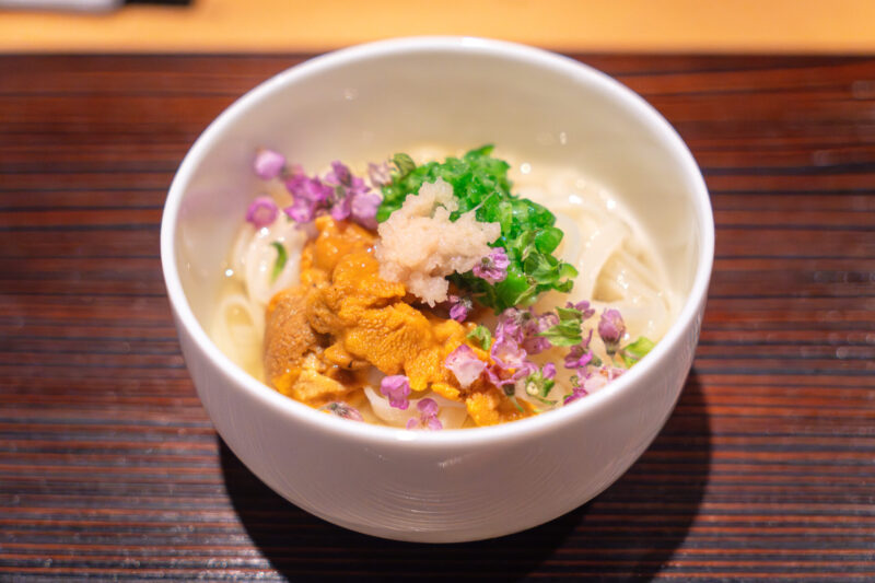その雲丹を口に含むと、濃厚な甘みとともに、ミネラル感を伴った旨みがふわりと広がり、香り高い海苔と合わさることで、ひと口の中に奥行きが生まれる。