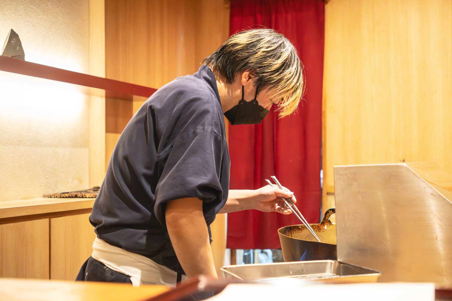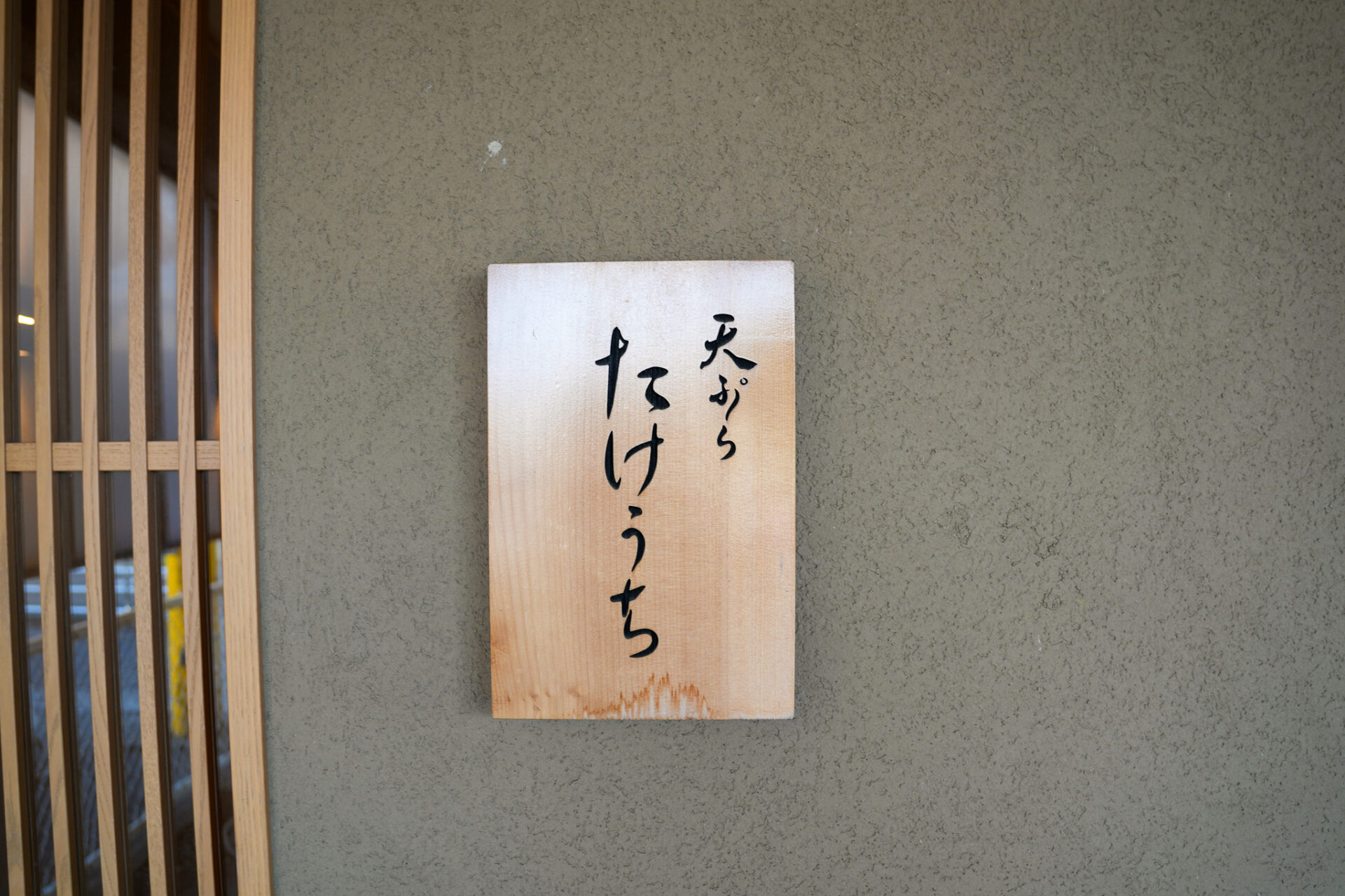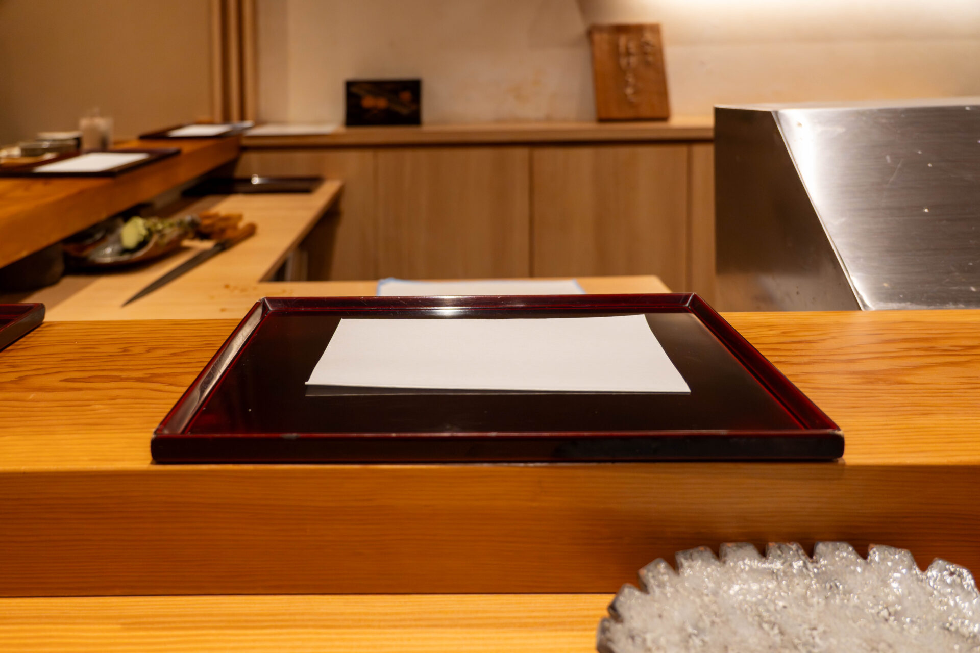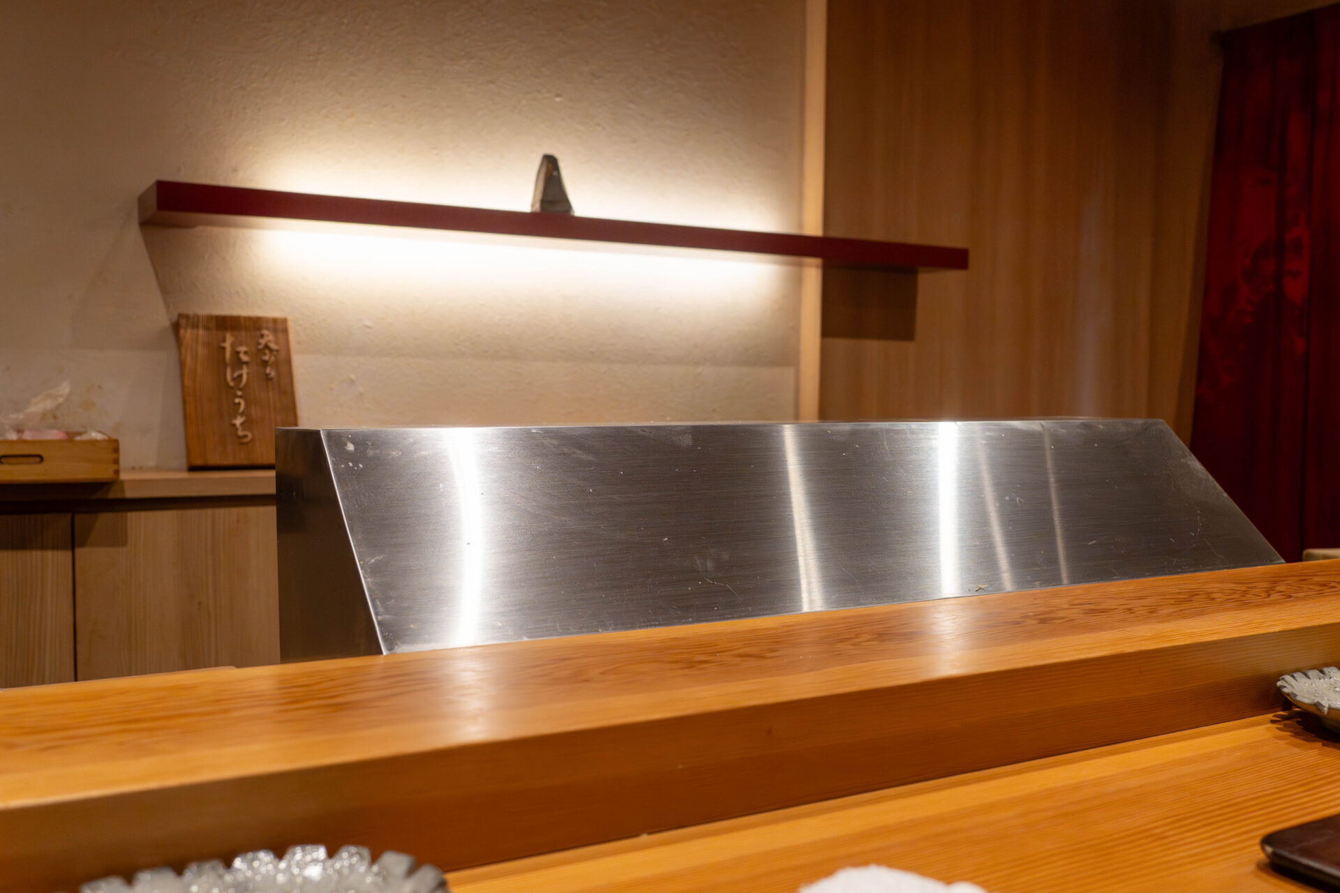 店内はカウンター9席のみ。木目の美しいカウンター越しに、大将の手元や揚げ台の動きがそのまま視界に入ります。艶のあるステンレスの揚げ台は磨き込まれ、照明の光を柔らかく反射。背後の壁には「たけうち」と刻まれた木札がさりげなく置かれ、余計な装飾を排したシンプルな空間が広がります。赤い布地のカーテンや間接照明が落ち着きを添え、訪れた人の意識を自然と料理へと向けさせます。