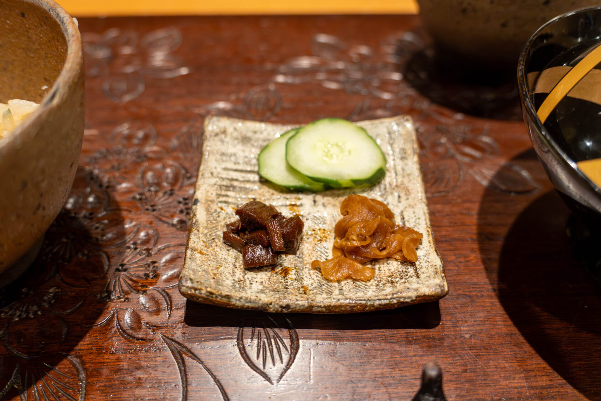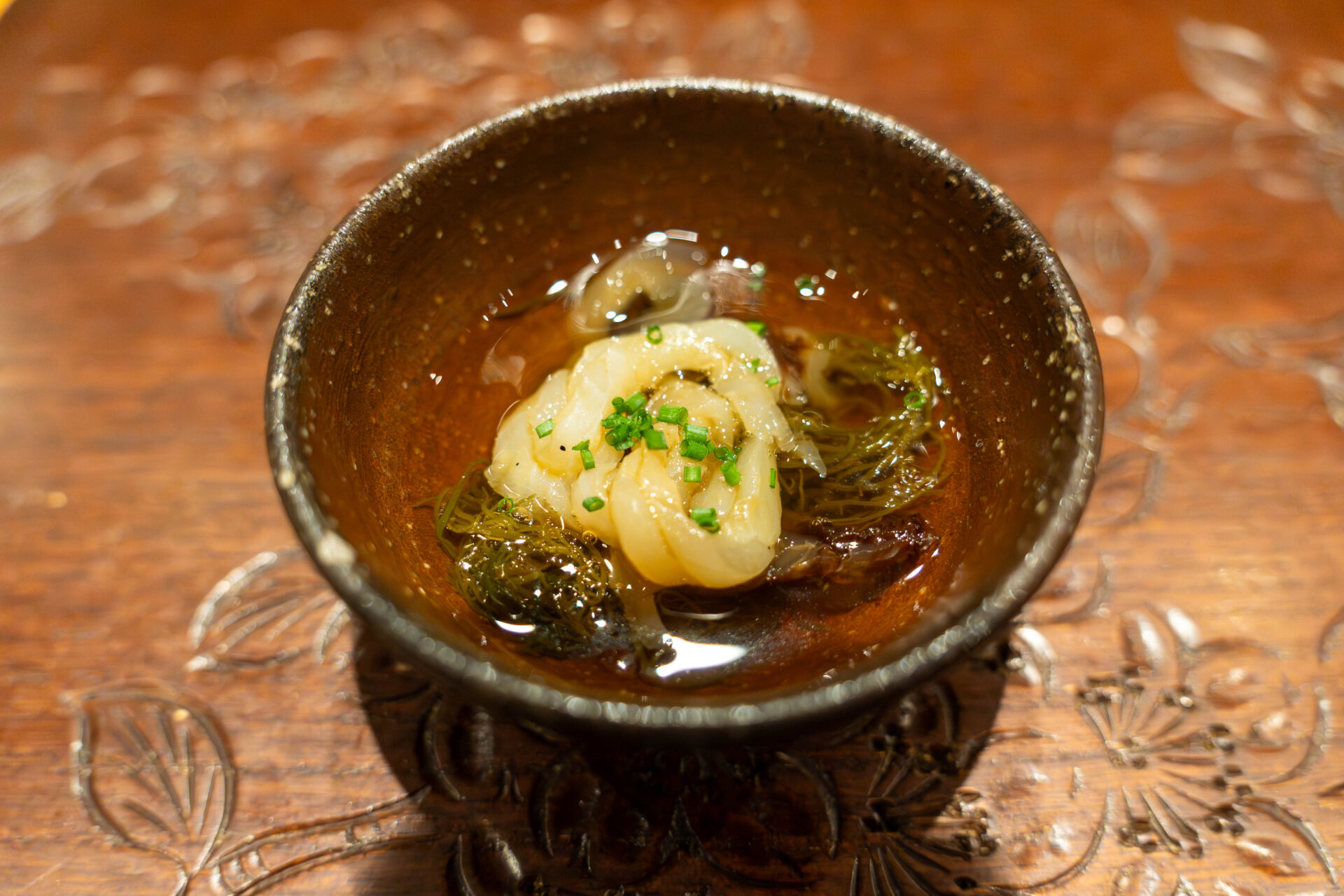 先付には、とらふぐの糸くず、石川産の岩もずく、有明のくらげを合わせた小鉢。とらふぐはねっとりと舌に絡み、岩もずくはするりと喉を抜ける心地よさ、くらげは小気味よく弾む歯ごたえが際立ちます。異なる食感が一口ごとに切り替わりながらも、やわらかな酸味と出汁が全体をまとめ、序盤ながら印象に残る一品です。