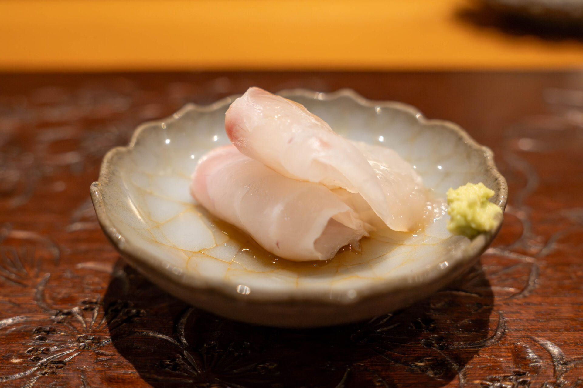 朝締めのイシガキダイを程よい厚みに引き、山葵を添えて。噛みはじめに感じるしっかりとした歯ごたえと、徐々に滲み出る上品な甘み。身にのった脂は控えめながら旨みが濃く、山葵の香りがそれをきれいに引き立てます。シンプルな構成ゆえ、魚の状態と仕事の確かさがそのまま伝わる一品です。