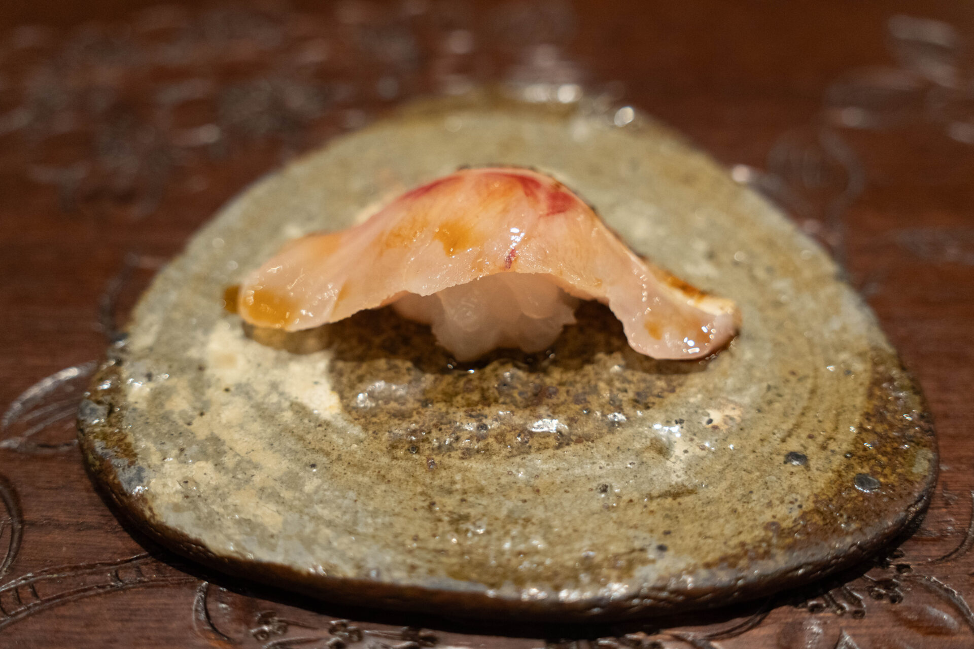 アカムツの昆布締めとヤリイカを重ねた一貫。アカムツは表面をバーナーで炙り、香ばしさを添えつつ脂をにじませる。下には包丁を細かく入れてねっとりとした舌触りに仕上げたヤリイカ。アカムツの豊かな脂と、ヤリイカのまろやかな甘みが重なり、食感は柔らかさとわずかな弾力が交互に現れる。噛み進めるほどに旨みが溶け合い、鮨というよりも“二つの海の恵みを一度に味わう”ような贅沢なひと口です。