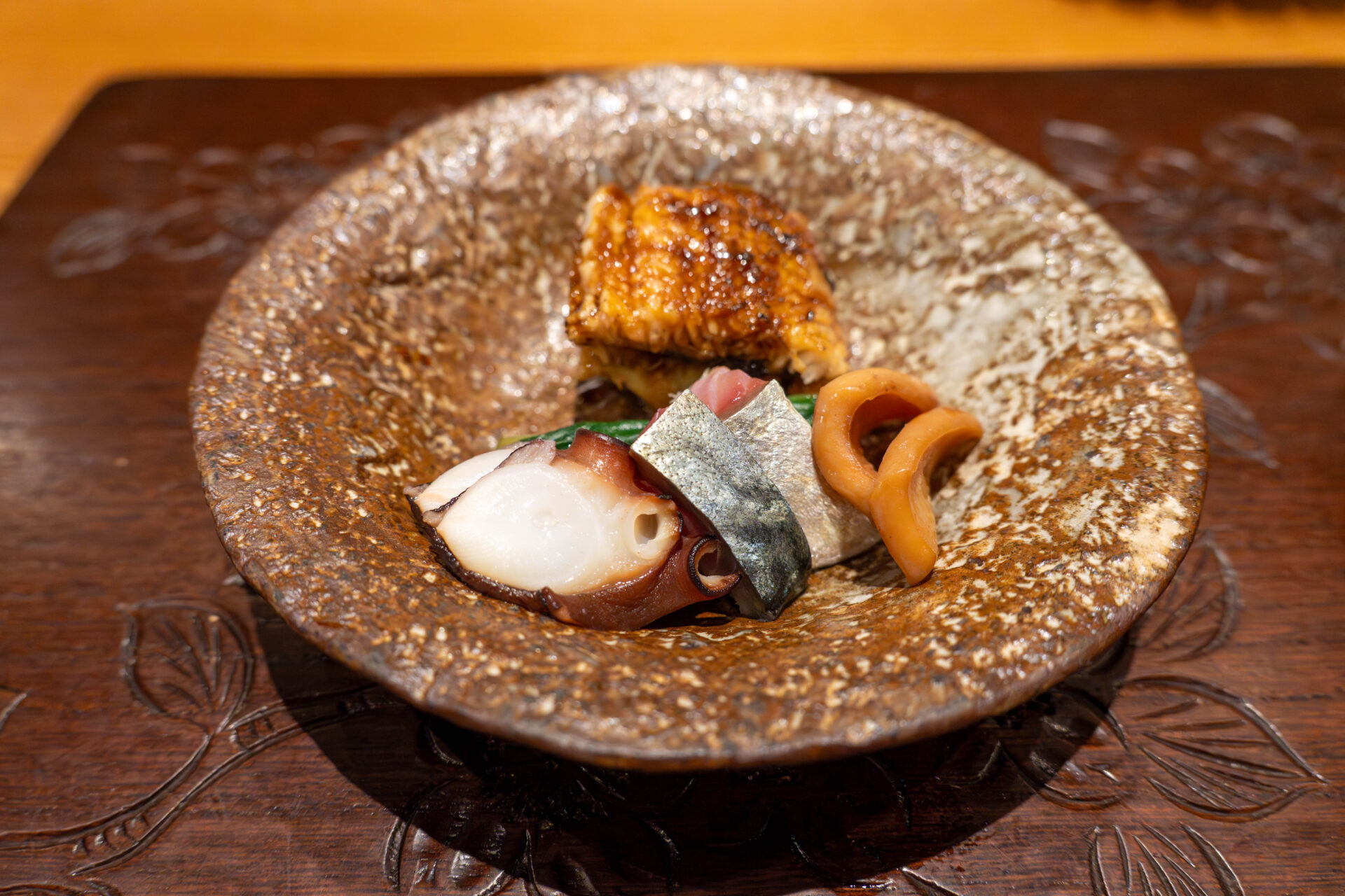 炭火で香ばしく焼き上げた愛知産の鰻は、脂の甘みと香りが凝縮。お好みで高知・仁淀川の山椒を添えれば、清涼感が後を引く。燻製にした蛸は、噛むほどに燻香と旨みが広がり、柔らかさの中に心地よい歯ごたえ。対馬の鯖は軽く締めて、脂の旨みと酸味のバランスを生かし、ヤリイカはオイル漬けにしてまろやかな甘みとコクを纏わせている。ひと皿の中で異なる海の表情を味わわせる盛り合わせです。