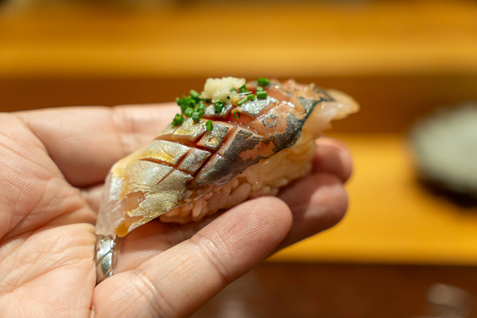 天ぷらに入る前、たけうちでは本格的な握りも楽しめる。脂ののった鯵は、表面に細かく包丁を入れ、薬味と生姜をのせて手渡しで供される。口に運べば、身の柔らかさと脂の甘みがほどけ、薬味が後味をきりりと引き締める。握り鮨専門店さながらの仕立てが、これから続く天ぷらのコースに向けて心を高ぶらせるひと口です。