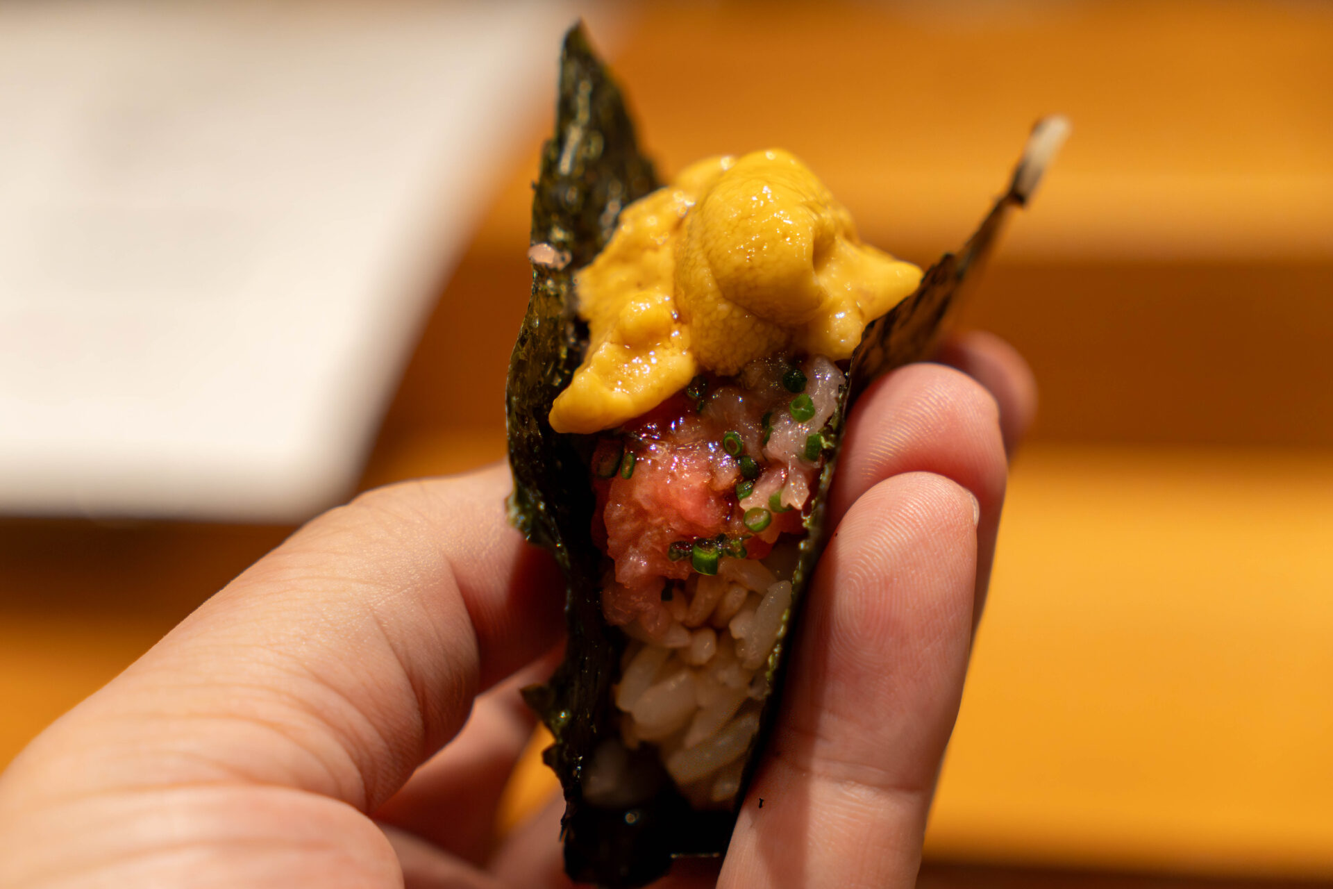 青森産本鮪のネギトロを芯に、天草産の赤ウニをたっぷりとのせた手巻き。脂の甘みとウニの濃厚さを、有明産の香り高い海苔が包み込む。噛むたびに海苔の香りがふわりと立ち、口いっぱいに広がる海の旨みと甘みが一体となる、贅沢なひと口です。