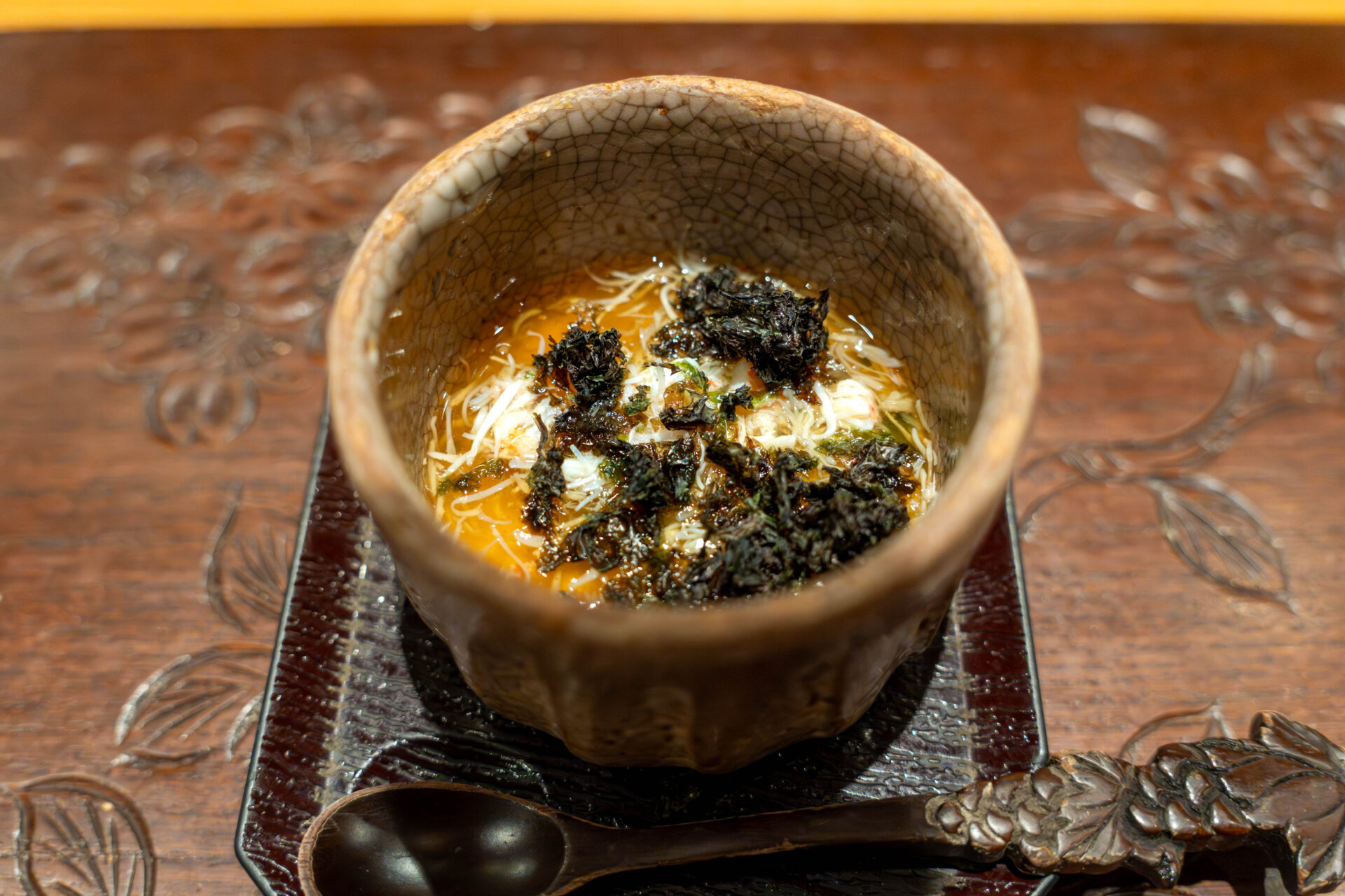 ずわい蟹のほぐし身と有明産海苔をあしらった茶碗蒸し。ふるりとやわらかな卵地の中に蟹の甘みが溶け込み、上から散らした海苔が香りを添える。出汁の旨みと磯の風味が一体となり、ほっとする温かさでコースの流れをやさしくつなぎます。