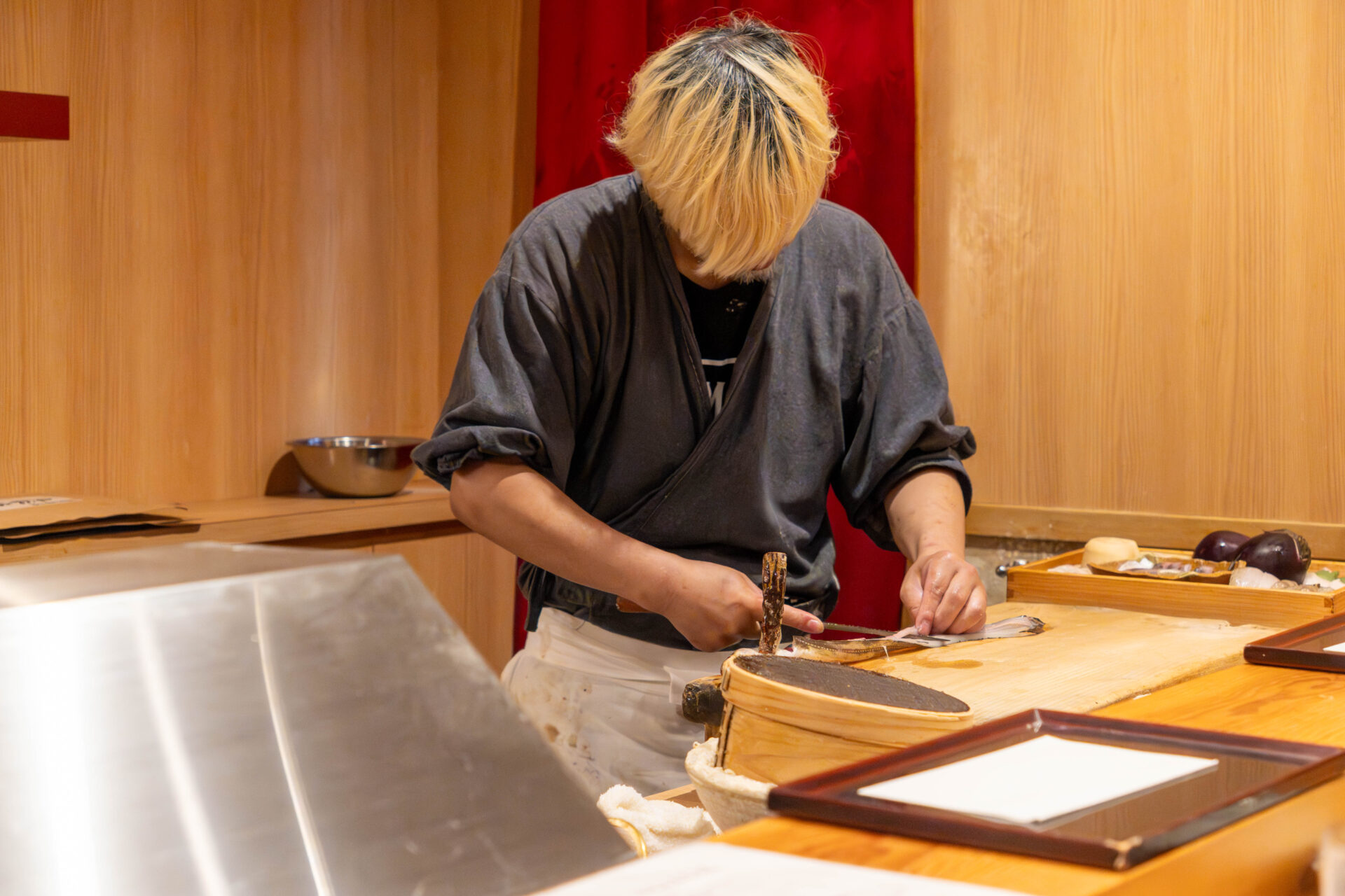 料理人は竹内貴之氏。熊本に生まれ、福岡で育ち、東京の老舗日本料理店で修業を積んだのち、26歳で那珂川の地に自らの店を構えました。開業当初から「一人で切り盛りできること」を大切に、天ぷらを軸に据えながら独学で技術を磨き、やがて鮨や和食を組み込んだ独自のコースを形づくってきました。開業から20年を経た今もなお、理想のかたちを追い求め、日々スタイルを更新し続けている。その姿勢が、この店の大きな魅力となっています。
