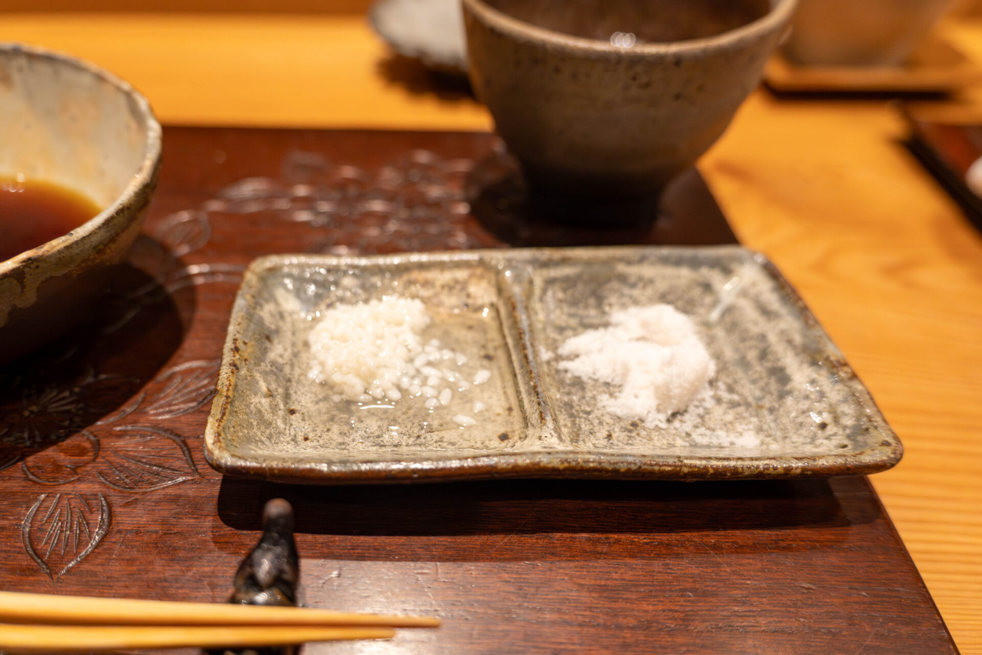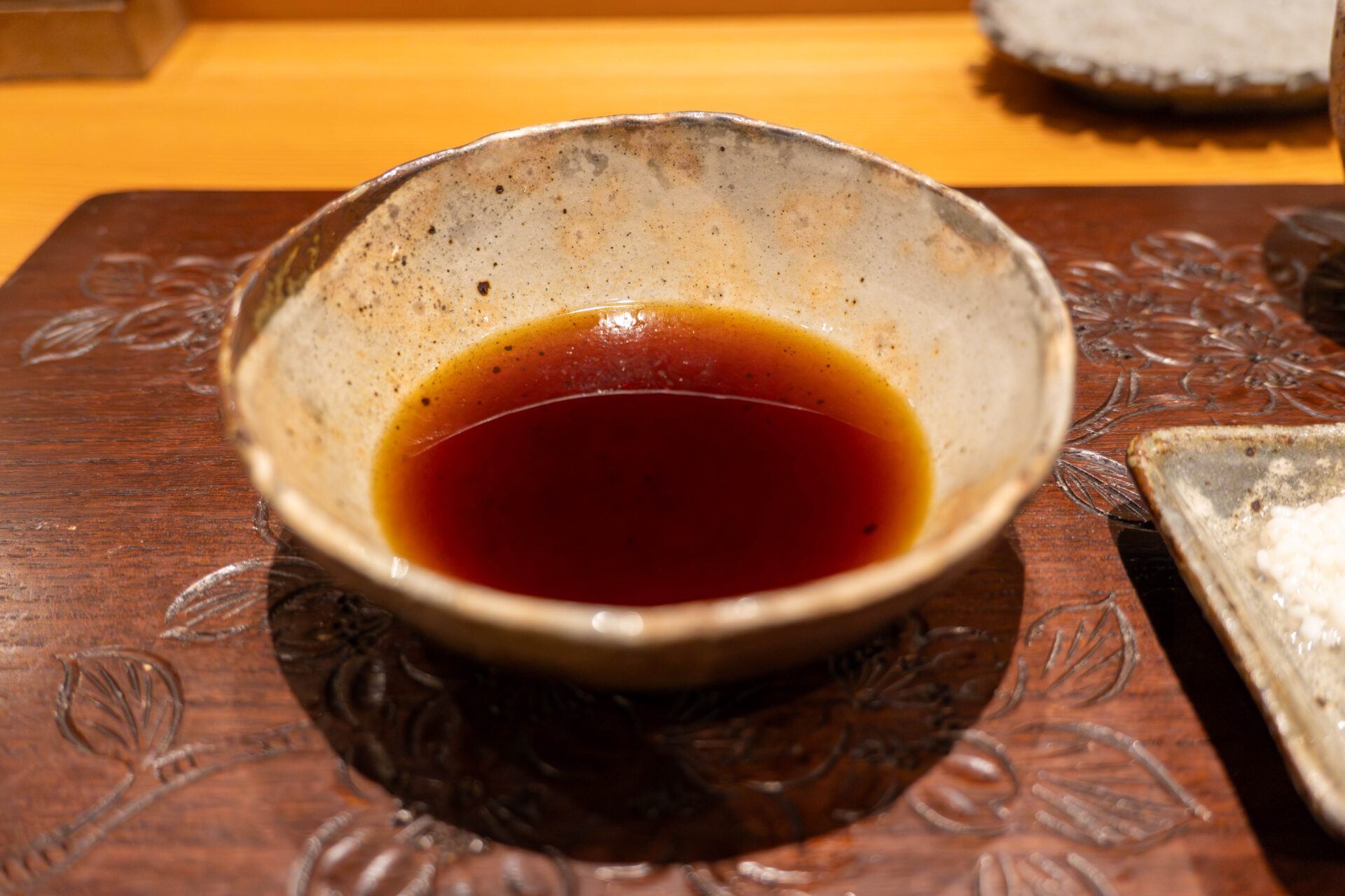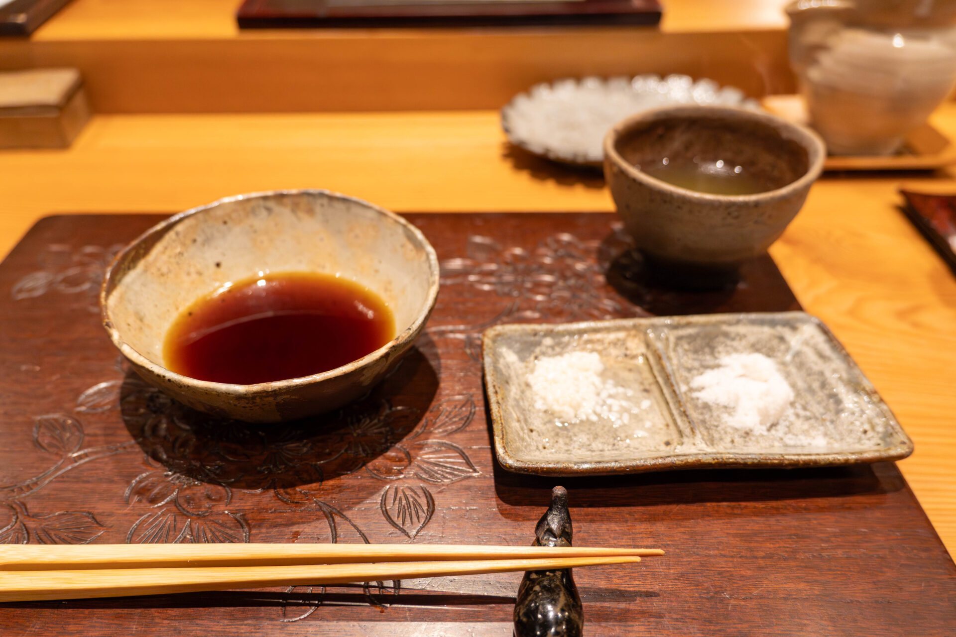 目の前には、お出汁と塩、そして塩麹が静かに用意される。澄んだ出汁は素材の旨みを引き立て、塩はシンプルにその味を際立たせる役目。塩麹はまろやかな甘みとコクを添え、揚げたての天ぷらにひと味違う表情を与える。すべてはこれから揚がる一品ごとに合わせ、最良のかたちで味わうための準備です。