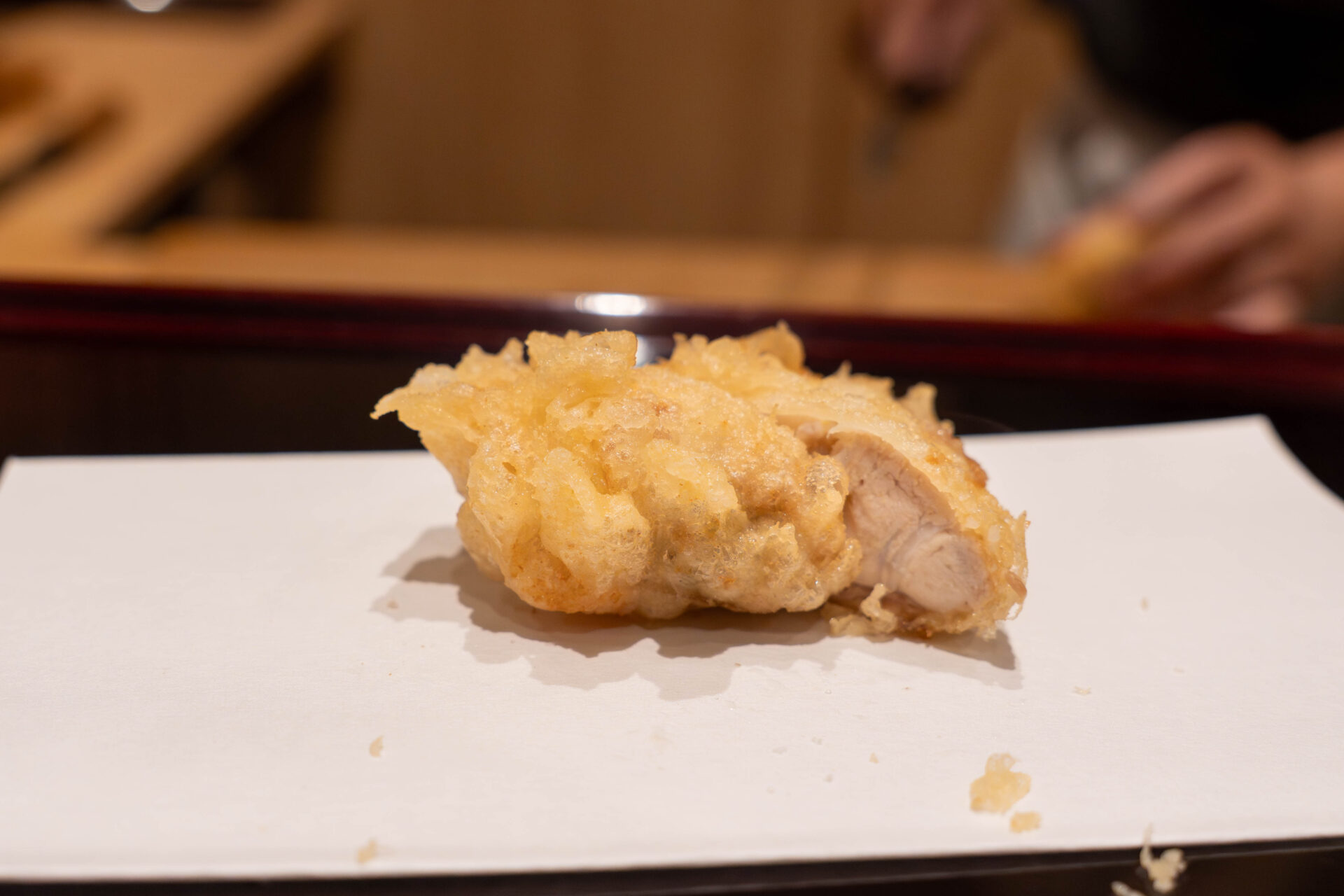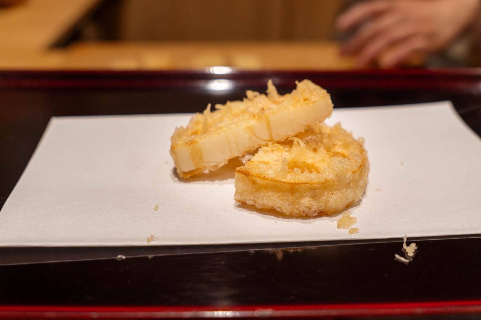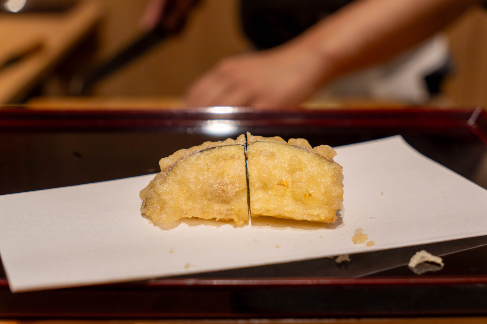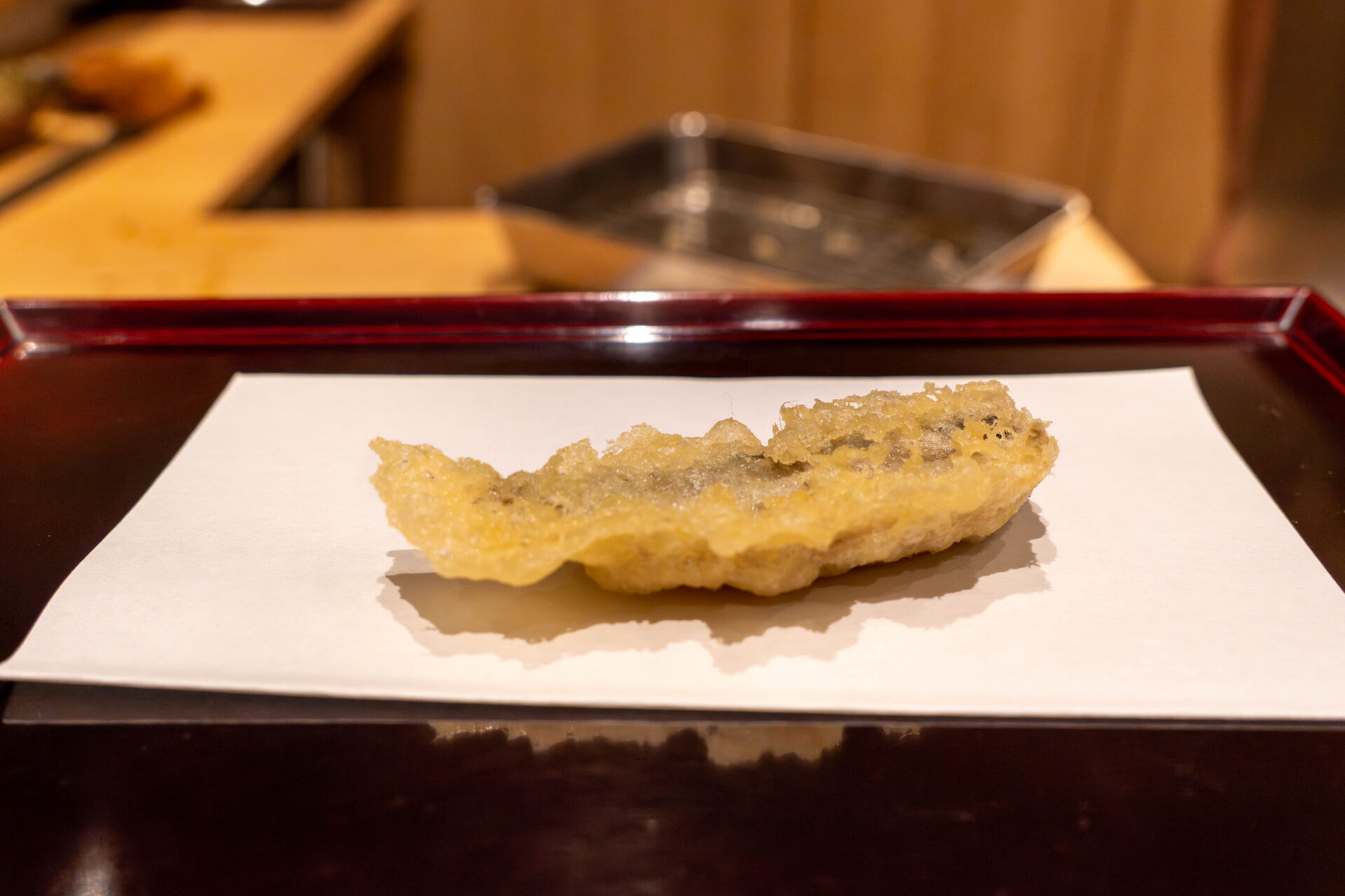 そして始まる天ぷらは、独学で積み重ねられた経験と工夫が随所に感じられるものでした。衣の軽さ、揚げの温度管理、素材との距離感——その一つひとつが型にはまらず、けれど芯の通ったアプローチでまとめられています。奇をてらうのではなく、素材を最大限に活かすための引き算と、食べ手を飽きさせない緩やかな変化が心地よく続いていきます。