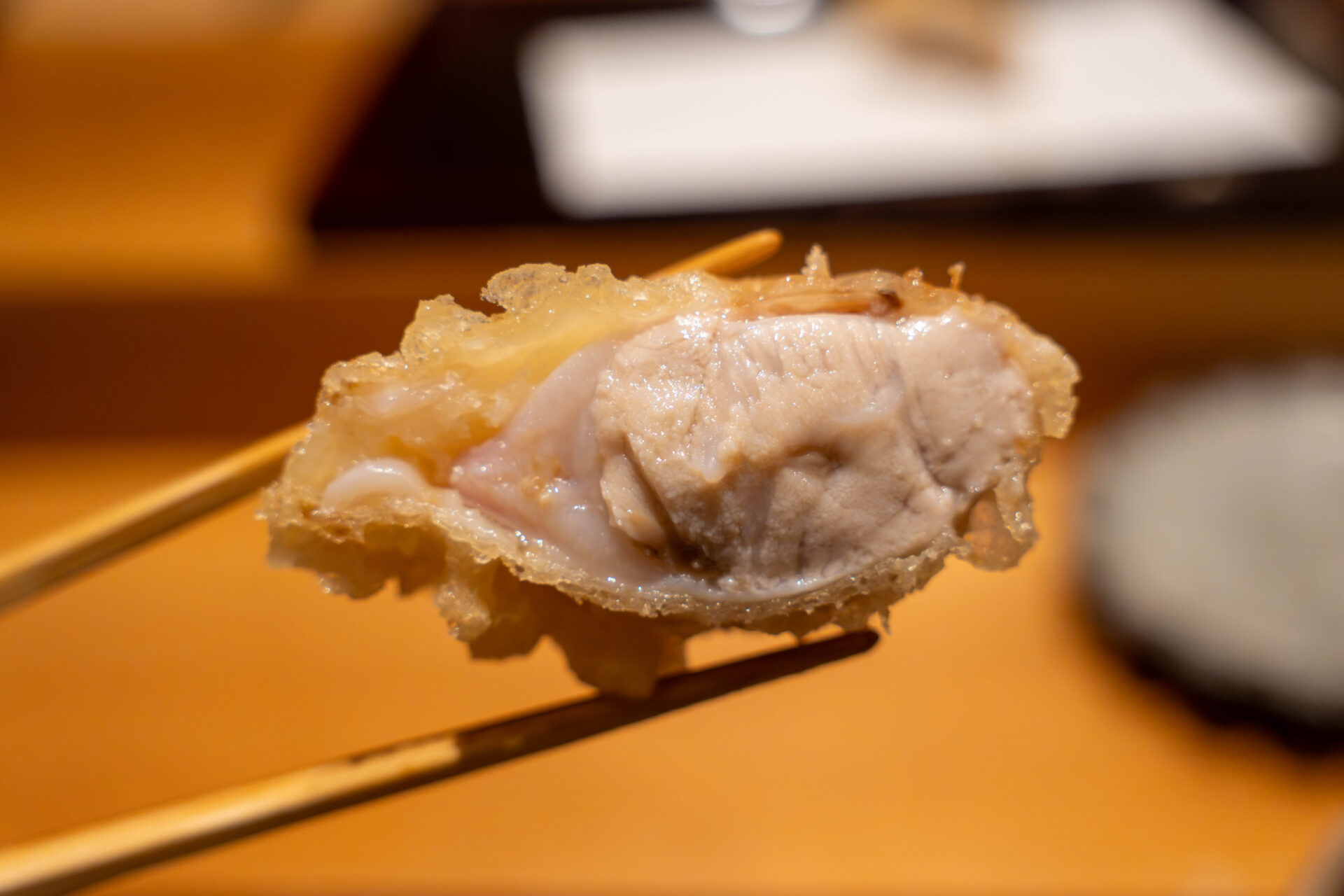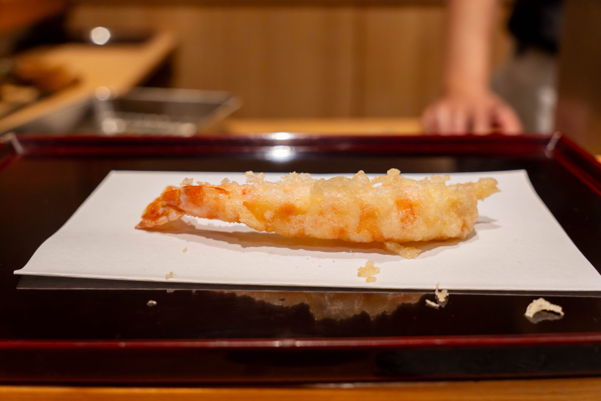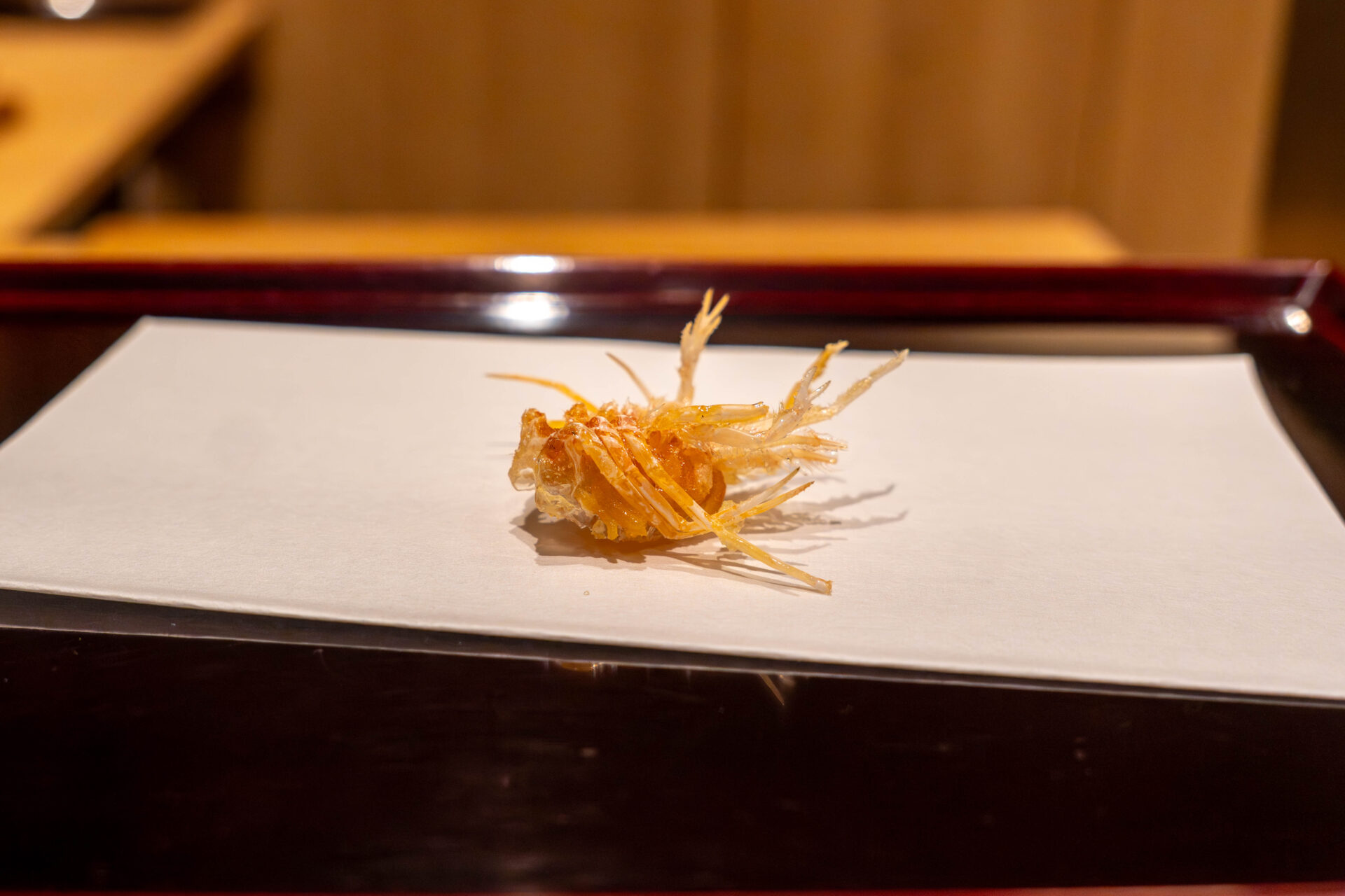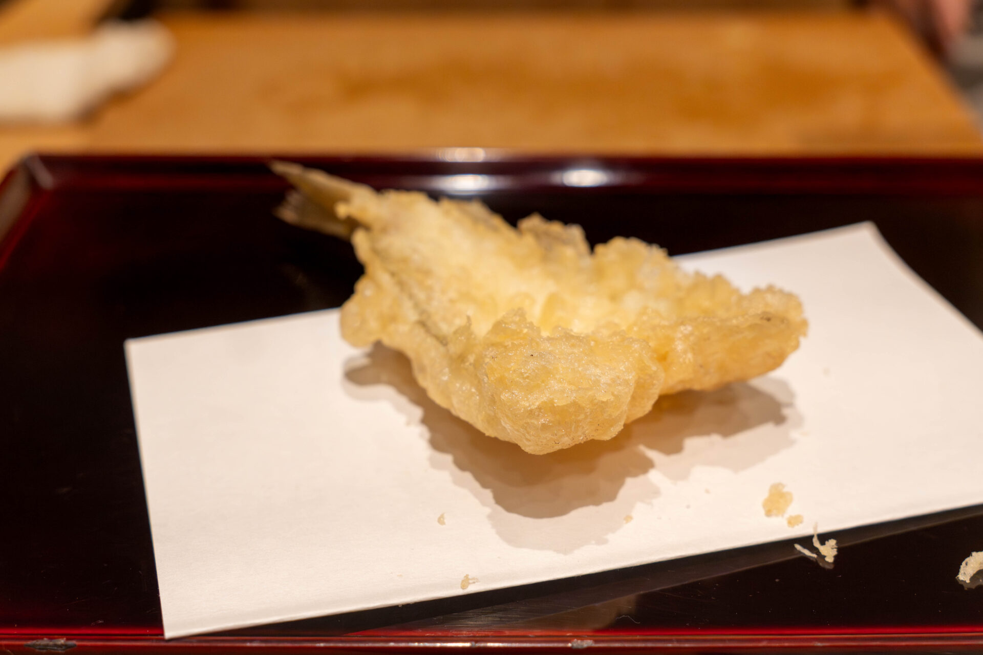 二品目は車海老の頭。殻ごと高温で揚げ、香ばしさと甘みを凝縮。カリッとした食感のあとに、海老味噌の濃厚な旨みが広がります。小さなひと口ながら、海老の魅力を余すことなく味わえる、香り高い一品です。