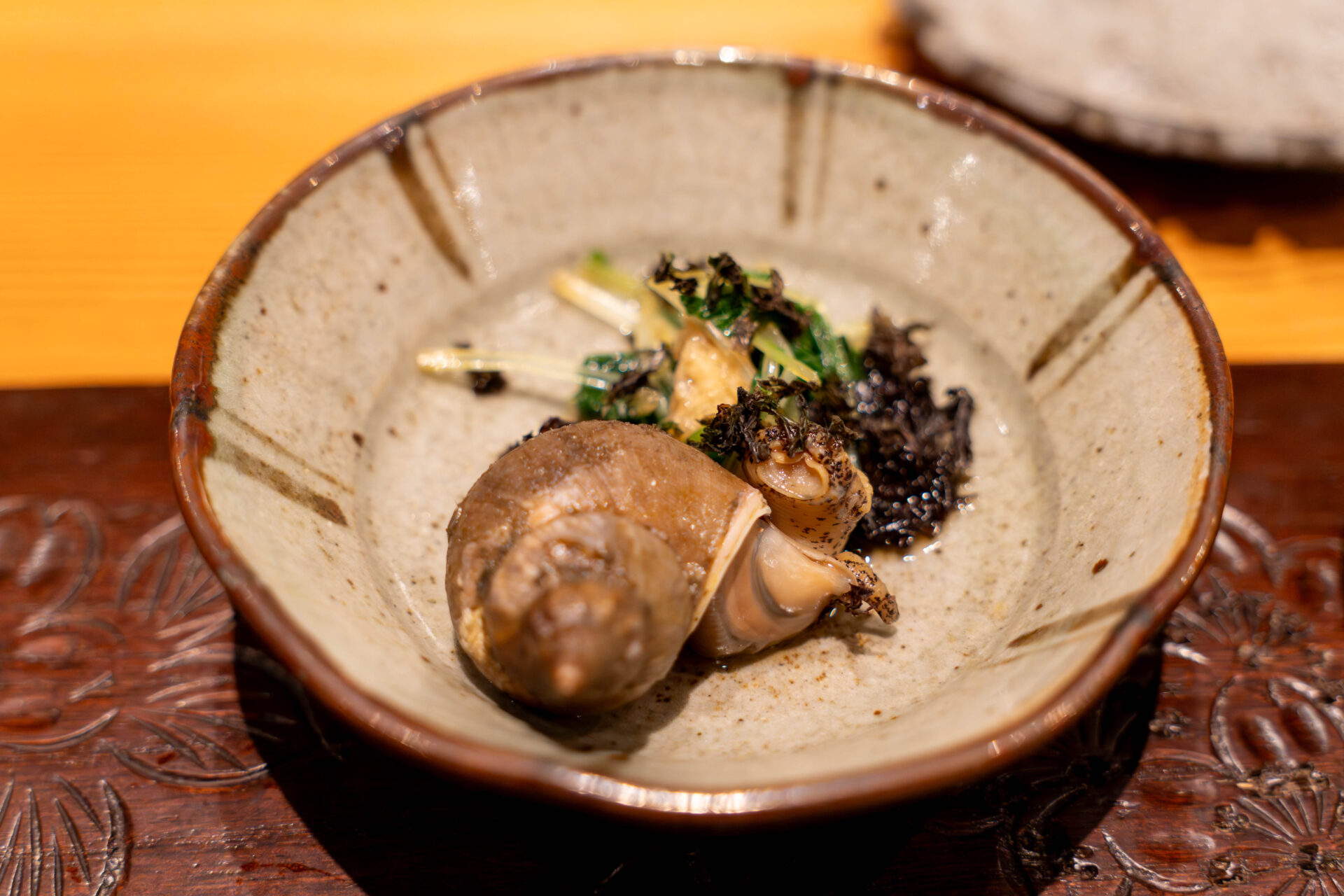 シャキシャキとした水菜、磯の香り豊かな岩のり、そして旨煮にしたツブ貝のコリッとした食感が三位一体となり、天ぷらの合間に口をリセットしてくれる一皿。