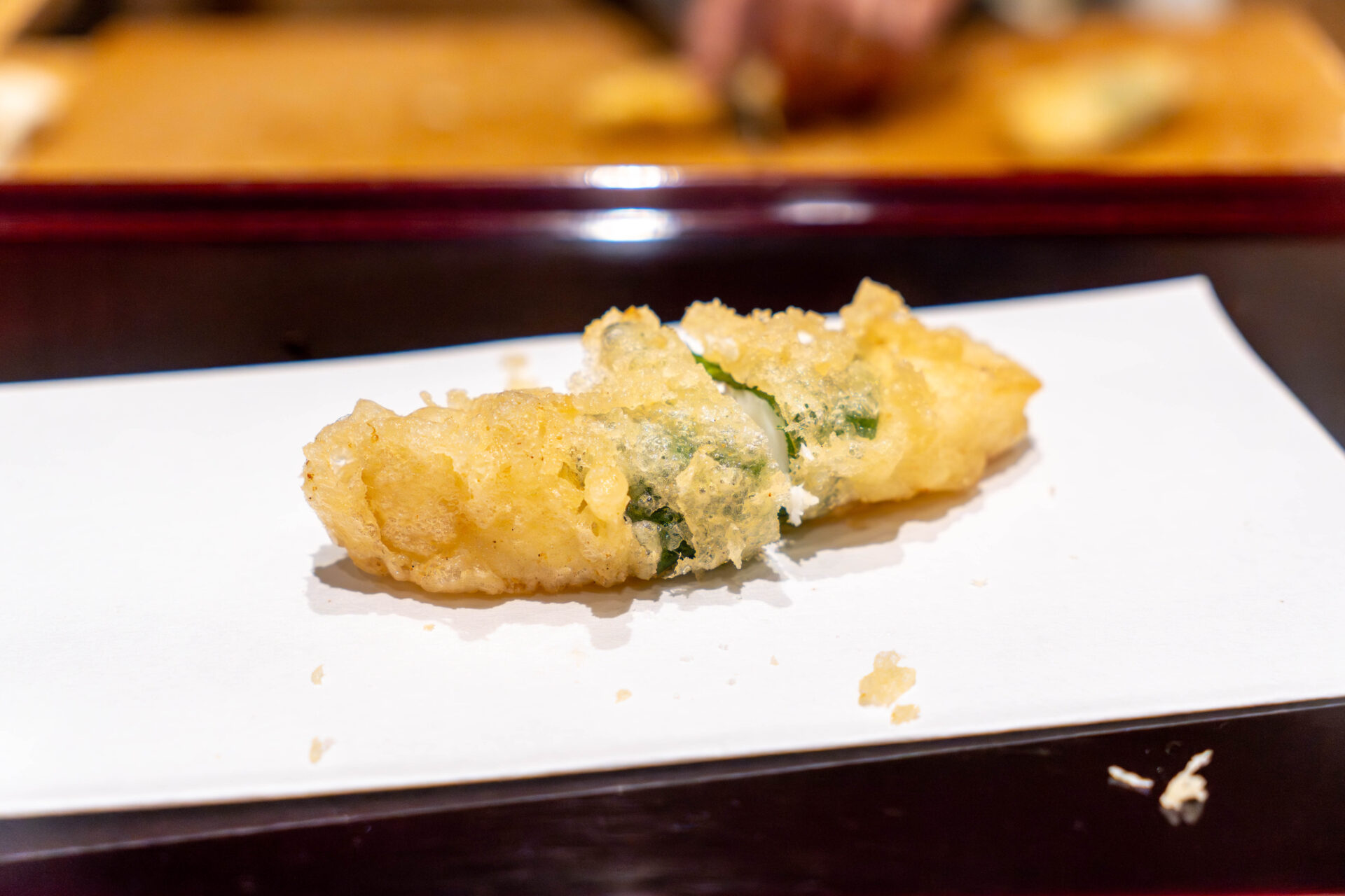 淡白なマナガツオを大葉で包み、香り高く仕上げた天ぷら。ふんわりとした身質と大葉の爽やかさが絶妙に調和。