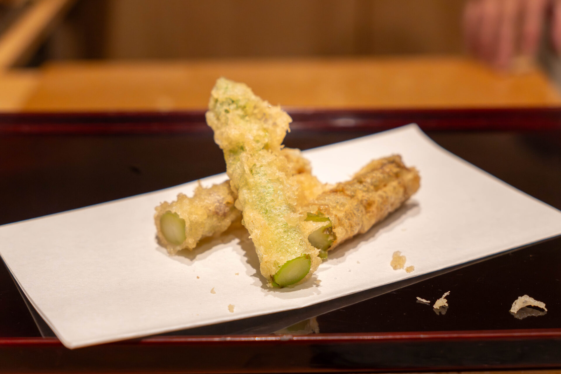 みずみずしい那珂川産アスパラガスを天ぷらに。シャキッとした歯ごたえと、穂先の香りが広がる。