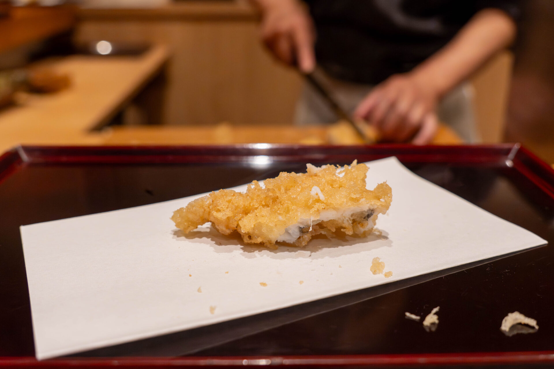 天ぷらの締めは、ふっくらと揚がった対馬産穴子。外は香ばしく、中はふんわりとした食感。