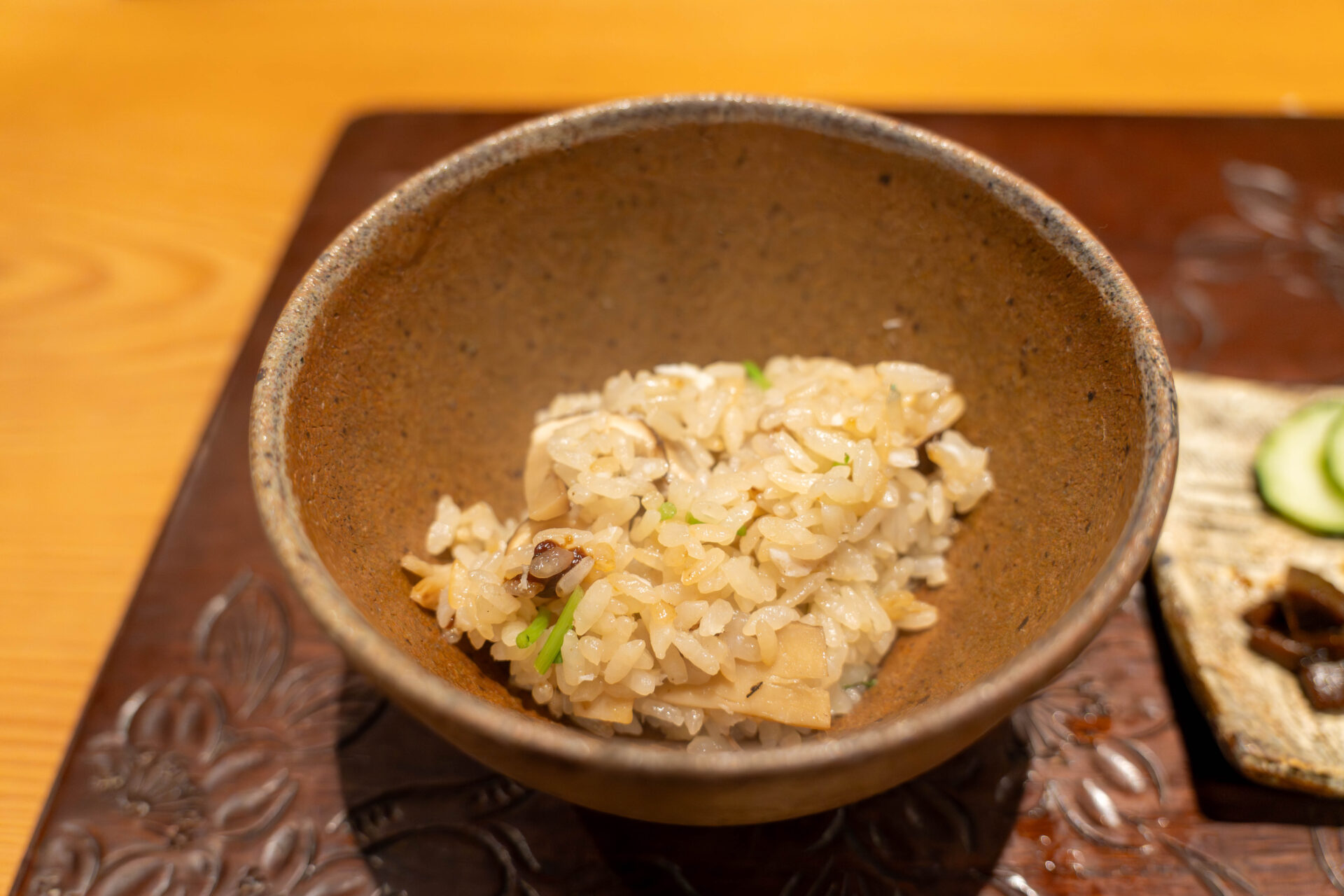 締めは旬を先取りした香り高い松茸と、旨味豊かなマナガツオを合わせた炊き込みご飯。