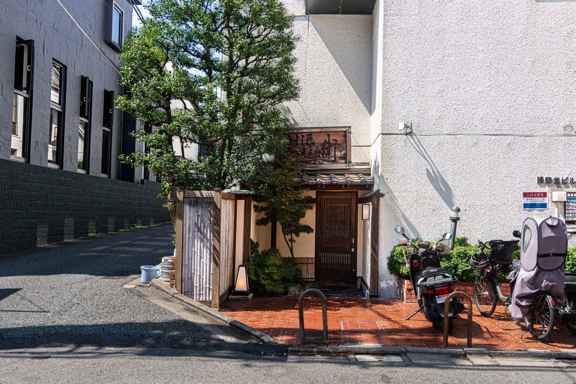 四谷の住宅街に溶け込むように構える「すし匠」の入口は、まるで町家の一角のような控えめな佇まい。白壁の建物の一角に瓦屋根をのせた小さな庇があり、その下に木格子の引き戸が据えられています。