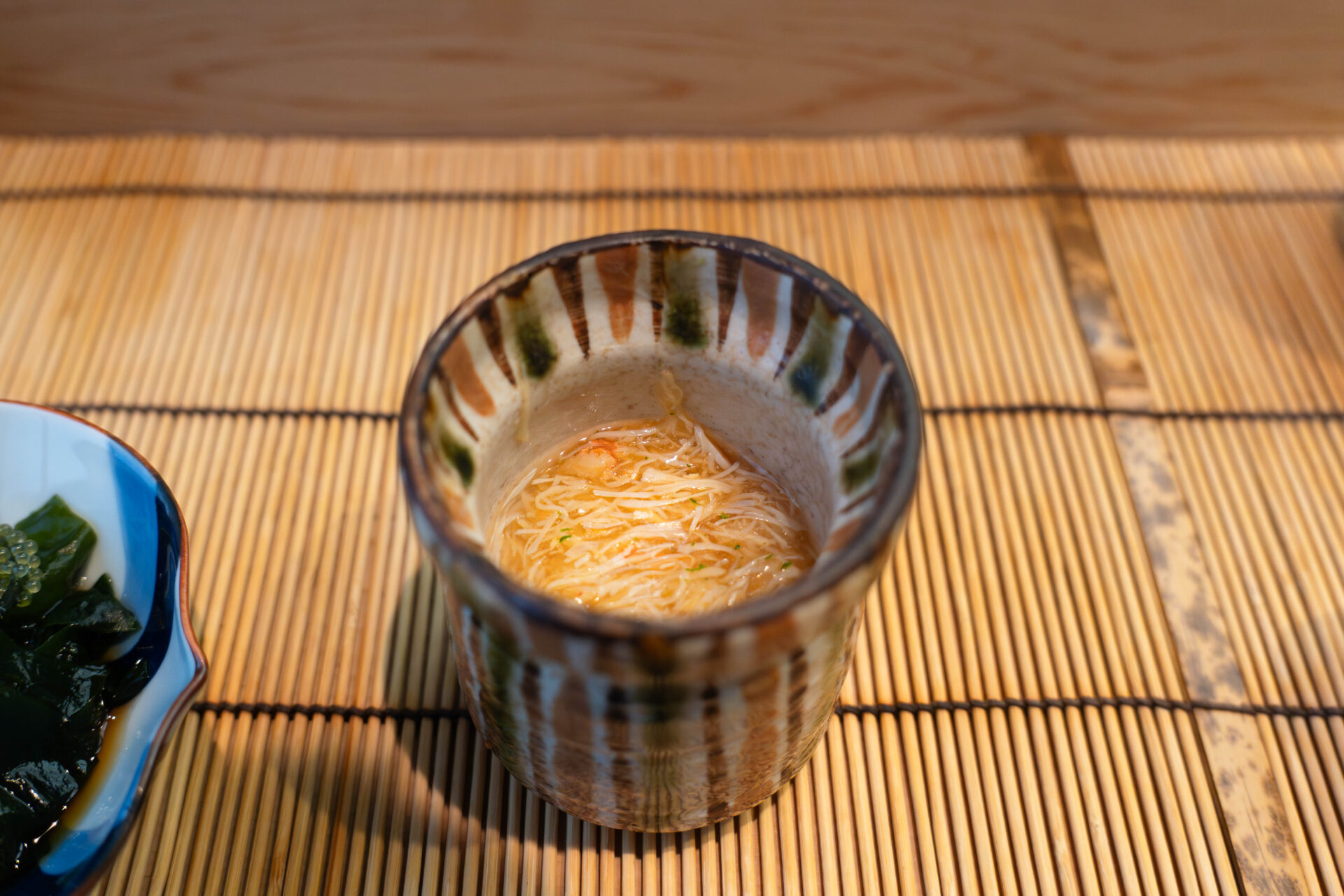 繊細な風味ながら滋味深く、体を静かに温めてくれるような一品。これから始まる鮨の流れに向けて、やわらかく舌を開いてくれる前奏の役割を担っていました。