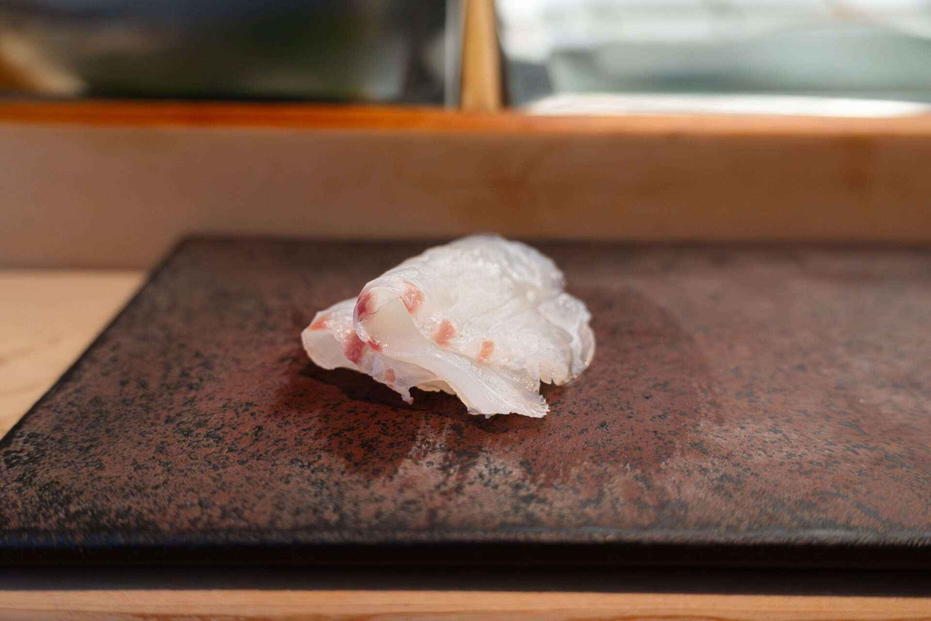 春子鯛の握りに続いて供されたのは、真鯛のお造り。透明感のある身は瑞々しく、舌にのせるとしっとりとした弾力を残しながら、淡い甘みが広がっていきます。