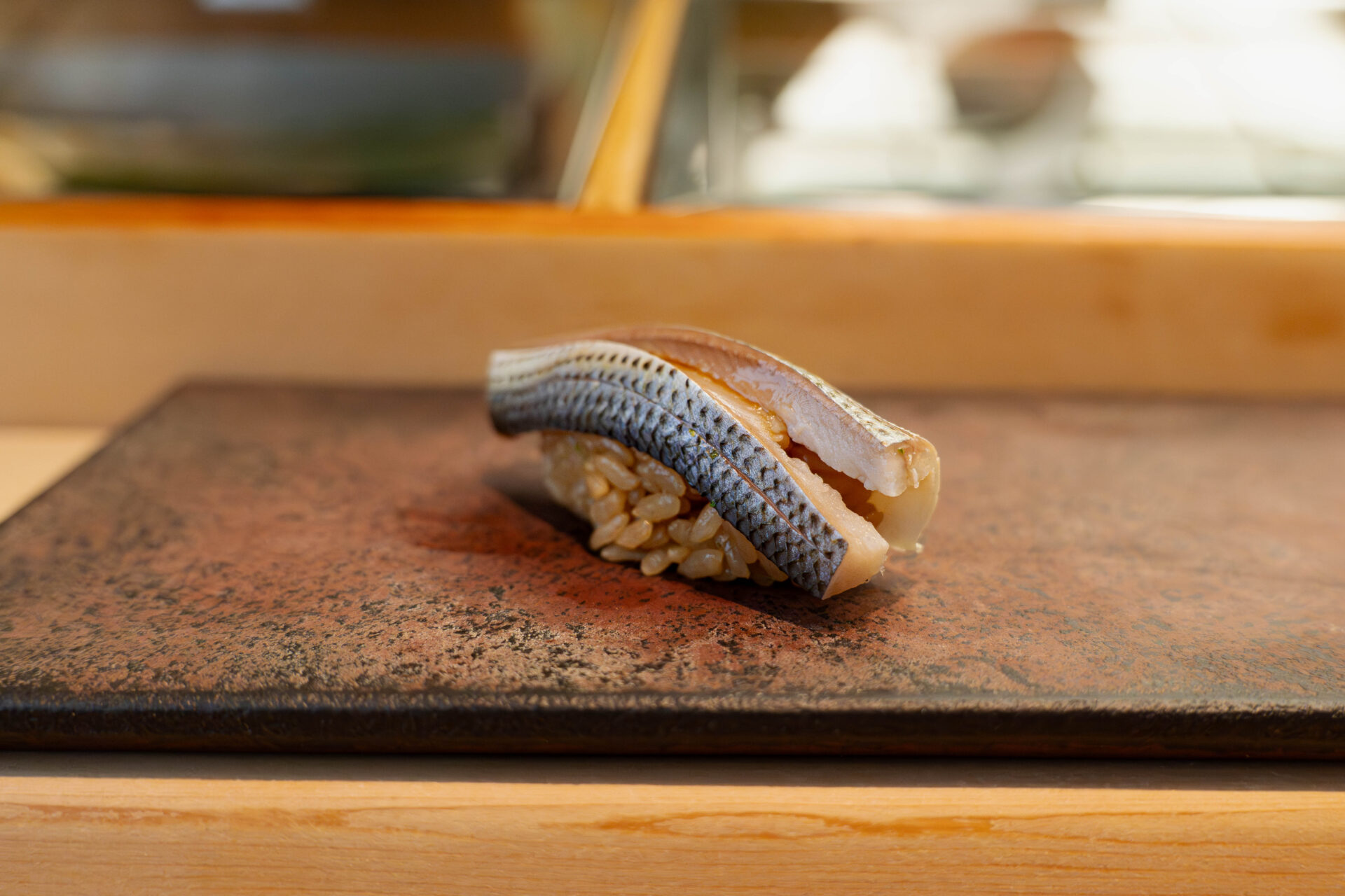 鮨の世界で“仕事”を象徴する魚のひとつ、小肌。すし匠では赤酢を効かせたシャリと合わせ、締めの加減が絶妙に仕立てられています。