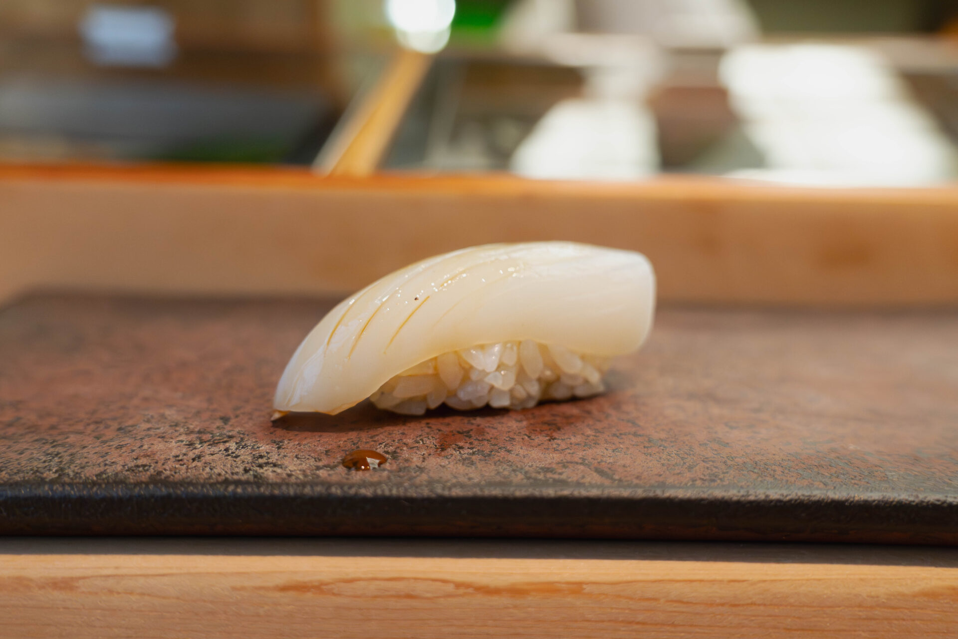 続いて供されたのは、スミイカの握り。透明感を残す白い身には細かな包丁目が入り、舌触りをやわらげながらも、絶妙な歯ごたえを残しています。