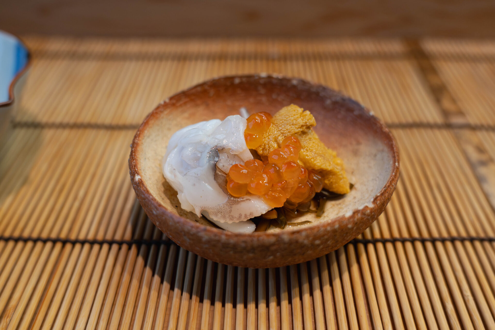 おまかせの合間に登場したのは、海の滋味を重ねた小鉢。昆布と数の子を漬け込んだ松前漬けを土台に、雲丹の濃厚な甘み、いくらのはじける塩味、そしてスミイカのゲソの心地よい歯ごたえが一体となっています。