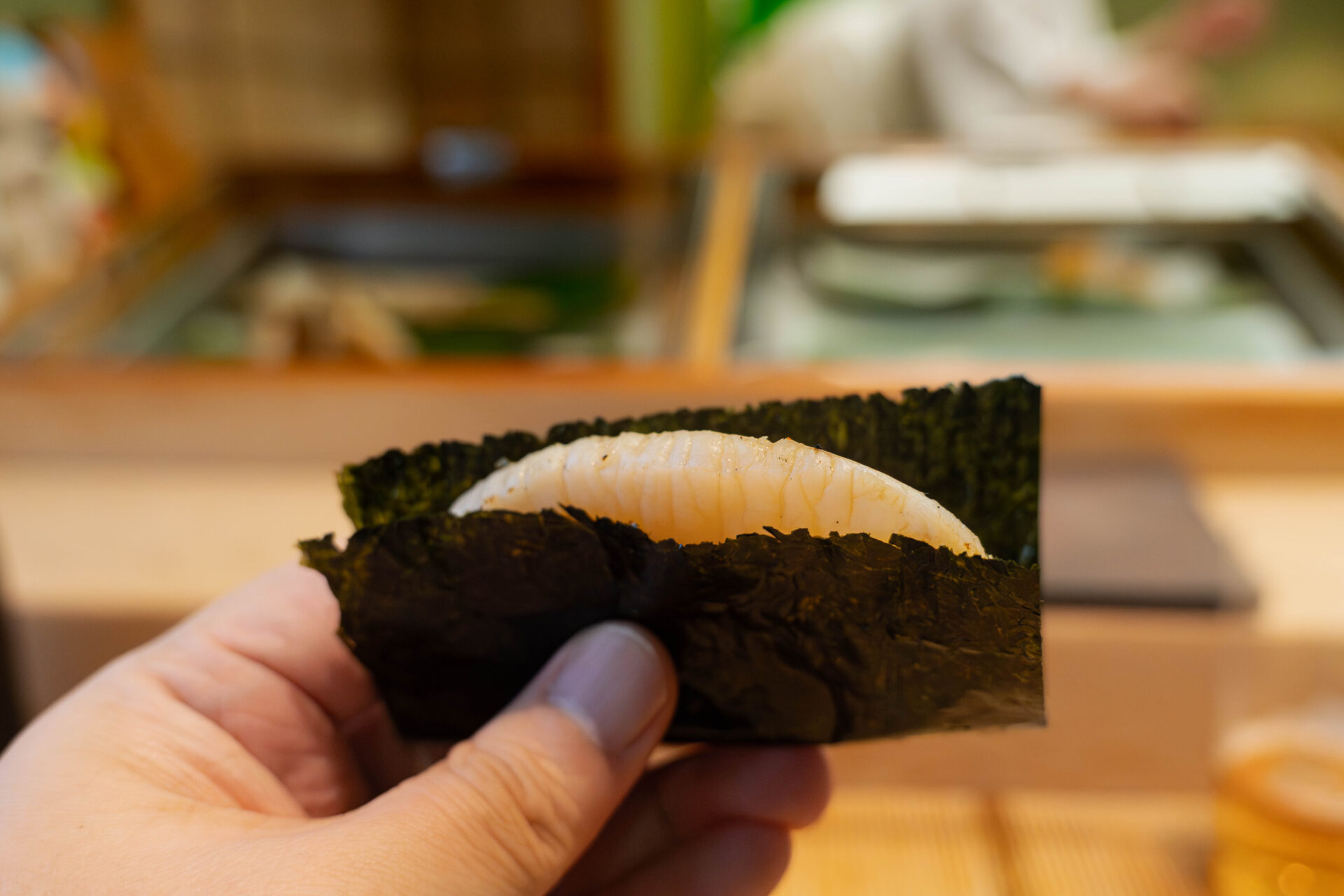 香ばしく炙ったタイラガイを海苔で挟み、目の前で手渡しされる一品。身はふっくらとしながらも弾力があり、焼きの香りと海苔の風味が重なって、口に入れた瞬間に広がります。