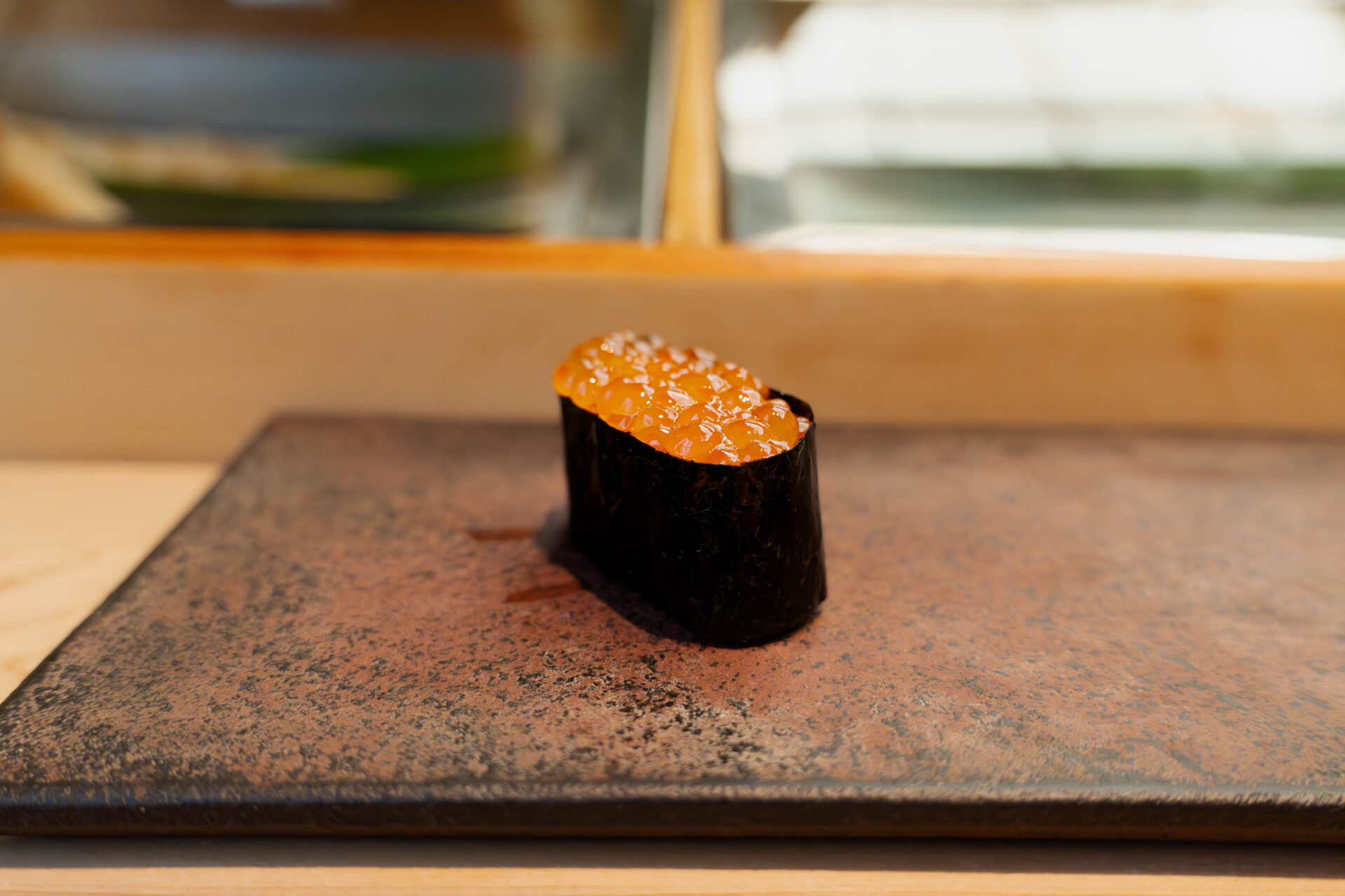 続いて供されたのは、艶やかな橙色に輝くいくらをたっぷりと盛った軍艦巻き。口に入れるとぷちりと弾け、海苔の香りとシャリの温度が一体となって広がります。