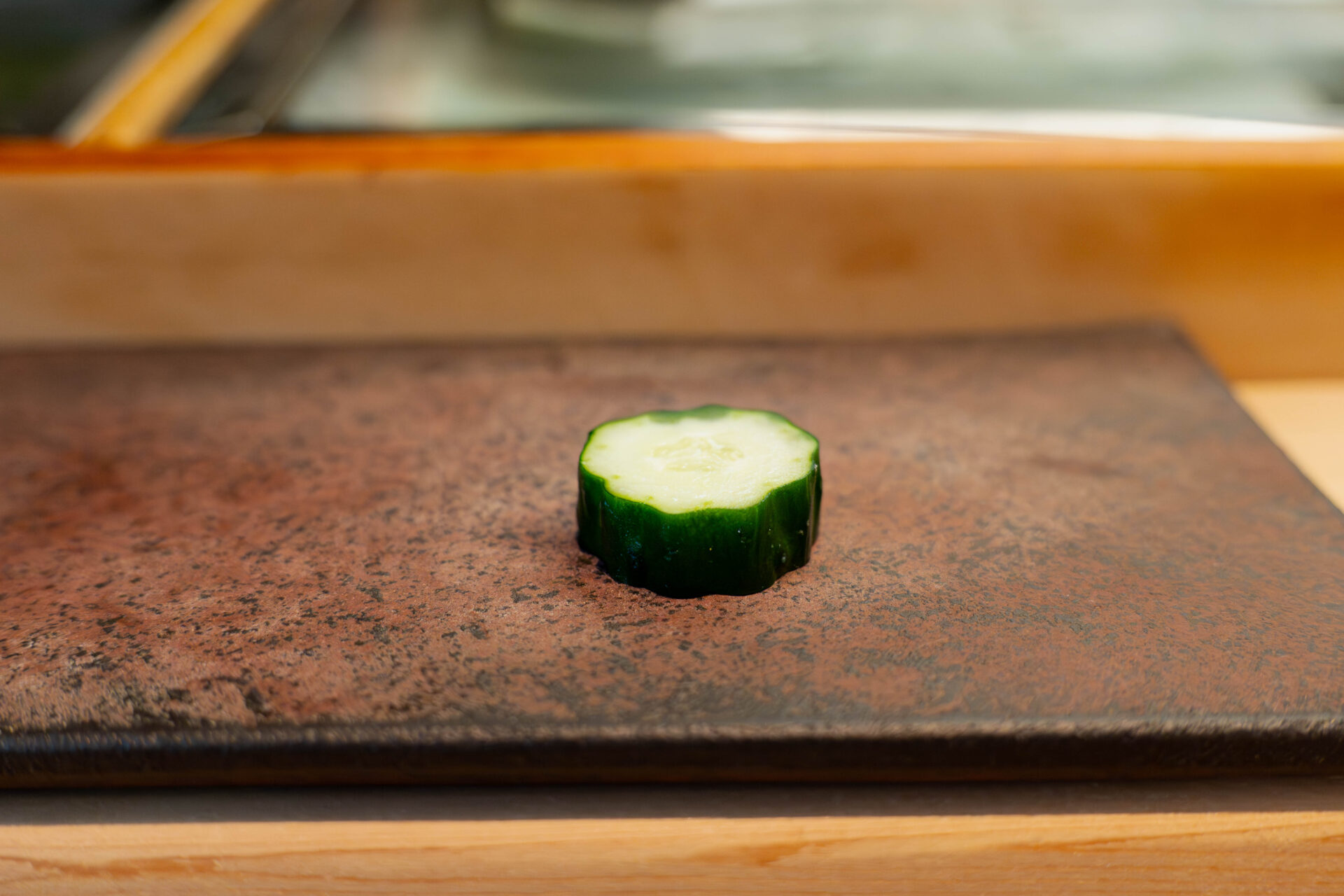 続く鮨の流れの合間に差し込まれたのは、胡瓜のぬか漬け。瑞々しい食感と、ぬかの香りがほんのりと広がり、口の中をすっきりと整えてくれます。