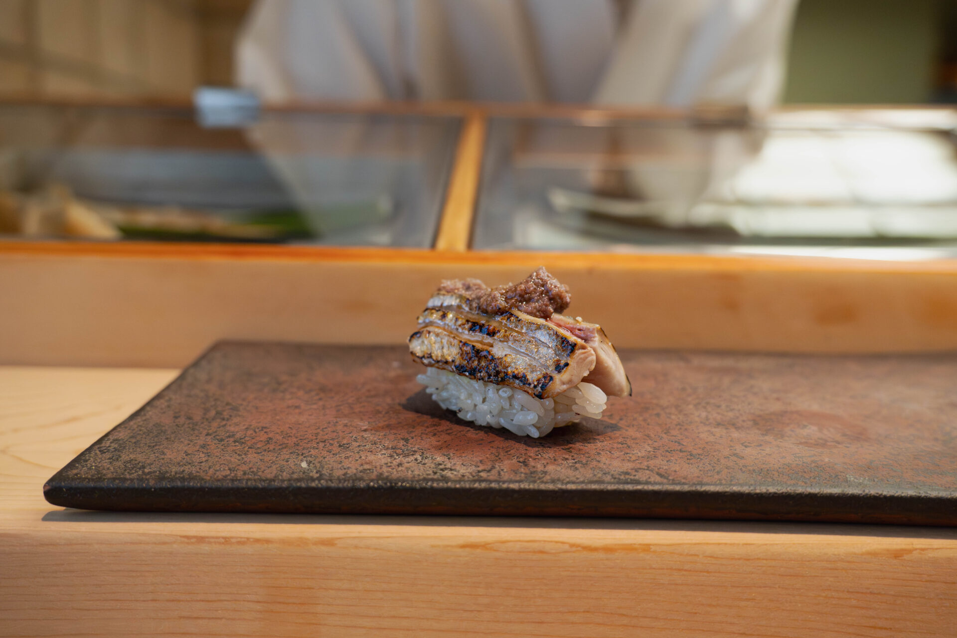 香ばしく炙られた秋刀魚の握り。脂ののった身からは香り立つような旨みが広がり、添えられた肝がさらに奥行きある味わいを添えています。