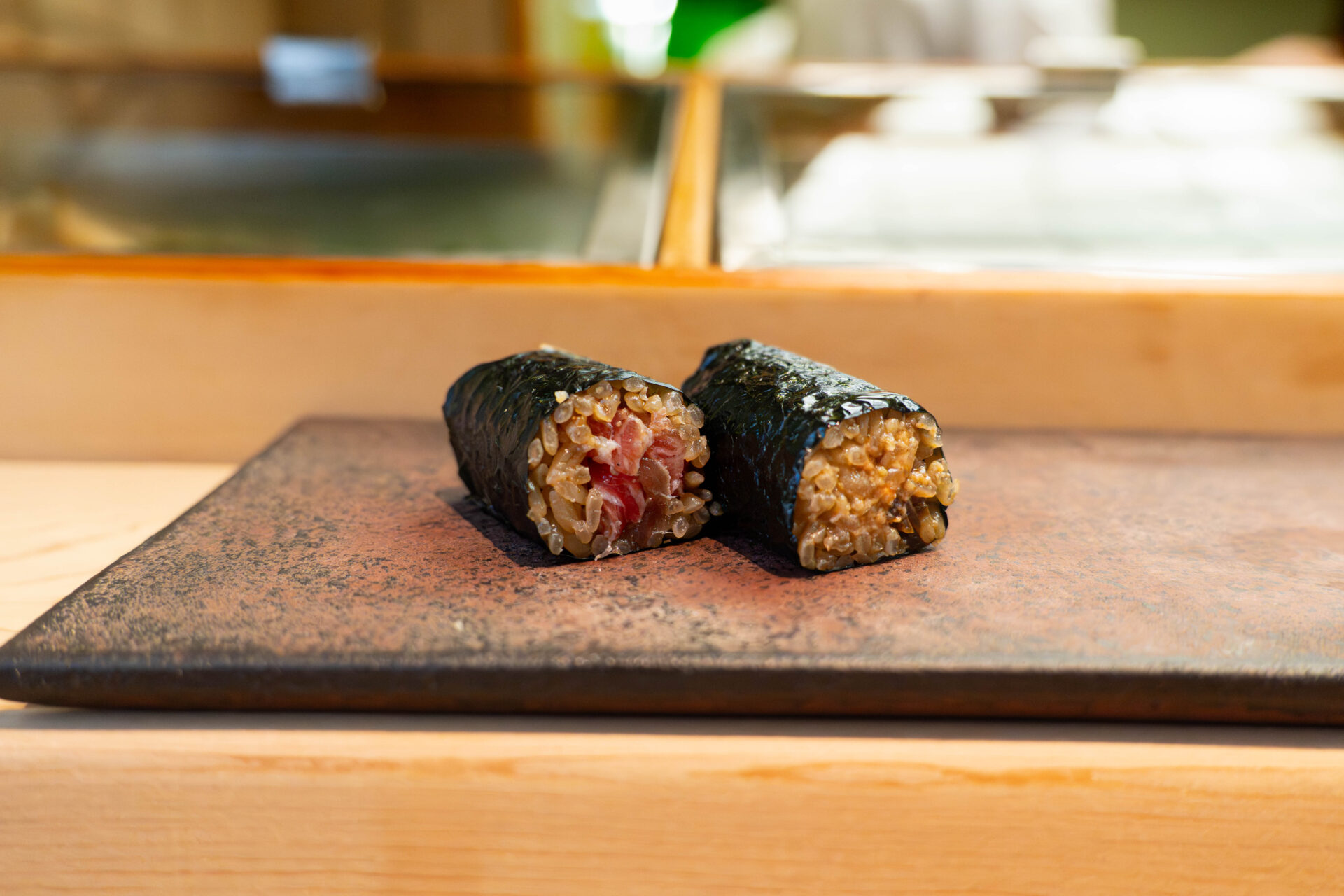 左は 熟成鮪のトロを刻んだ巻物。脂の甘みと熟成による旨みが凝縮され、シャリと海苔の香りに包まれて口の中でとろけるような味わい。