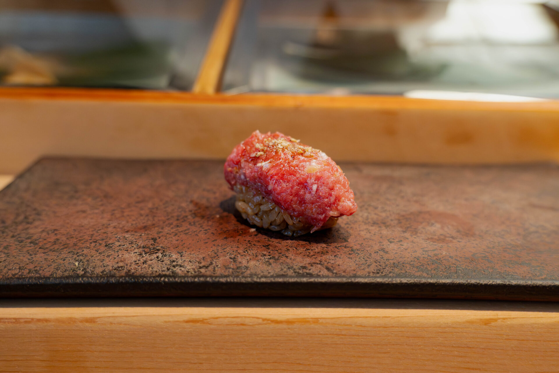 器に置かれるのではなく、手渡しで受け取るスタイルが印象的で、カウンター越しの距離が一層近づく瞬間。鮨だけではなく、食べ手とのやり取りそのものも含めて体験を構成する、すし匠らしい演出でした。