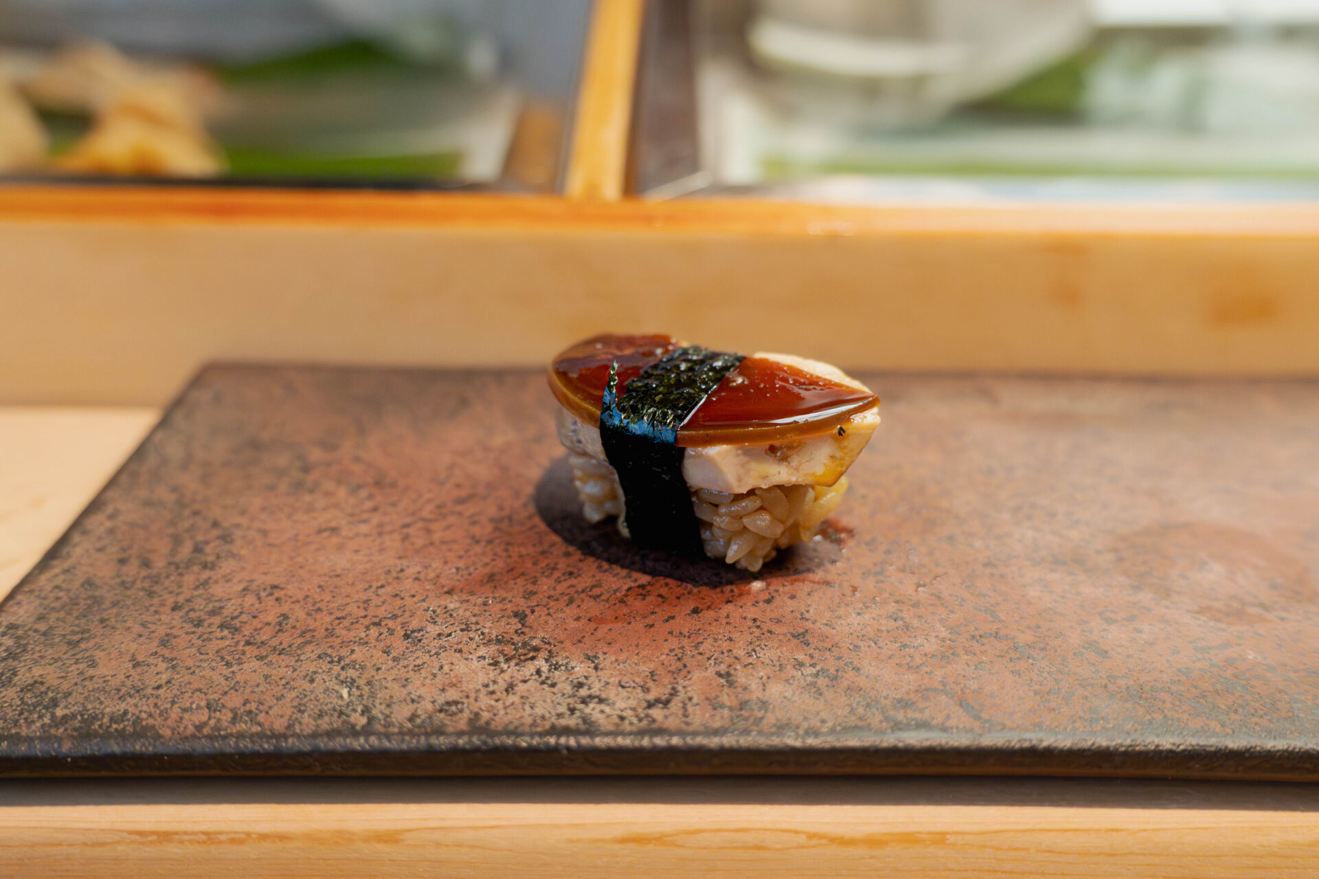 身はしっとりと艶を帯び、口に含むと酢〆ならではの酸味が広がり、赤シャリの深みある酸味と重なっていく。シャリの温度や粒立ちが、小肌の柔らかな身に調和し、噛み進めるごとに旨みが引き出されました。