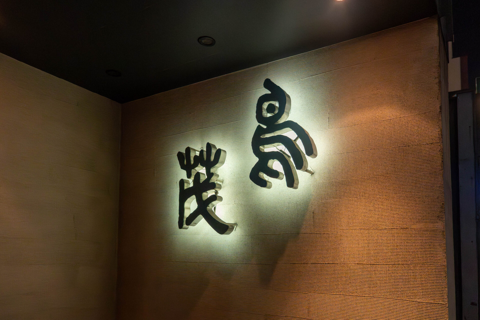 入口前の路地は幅が広くなく、街灯や看板の暖かい明かりが目印。外壁に掲げられた「鳥茂」の暖簾(のれん)と木製の案内看板が目を引き、夜になるとその照明が柔らかく路地を照らし、敷居が高すぎず温かみを感じさせます。ガラス戸や木の枠など、素材感のある重厚さと程よい年月をまとった存在感があり、通り過ぎてしまいそうで、しかし近づくとちゃんとそこにある存在感があります。