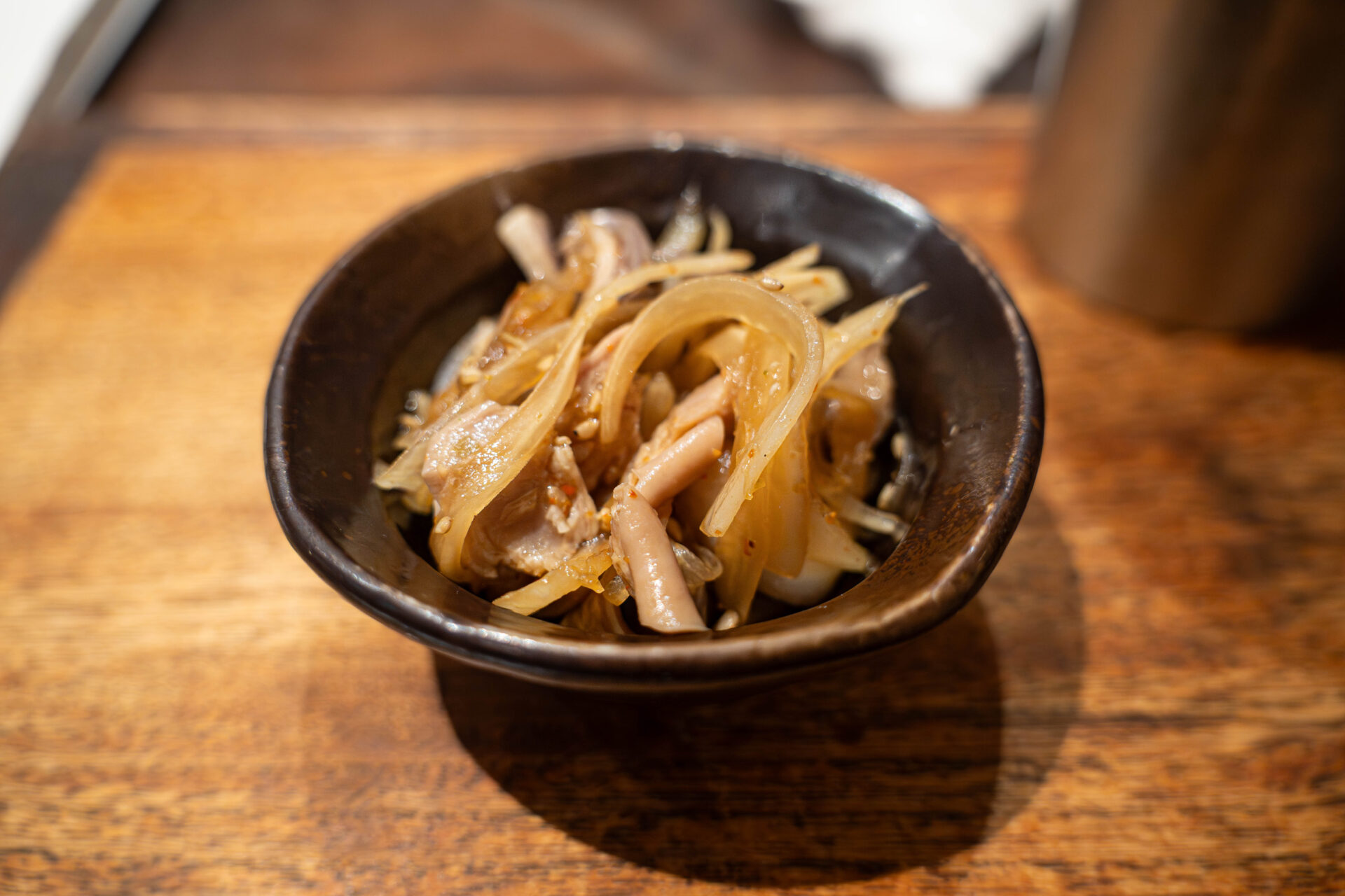 最初に供されるのは、お通しの 玉ねぎとガツの和え物。