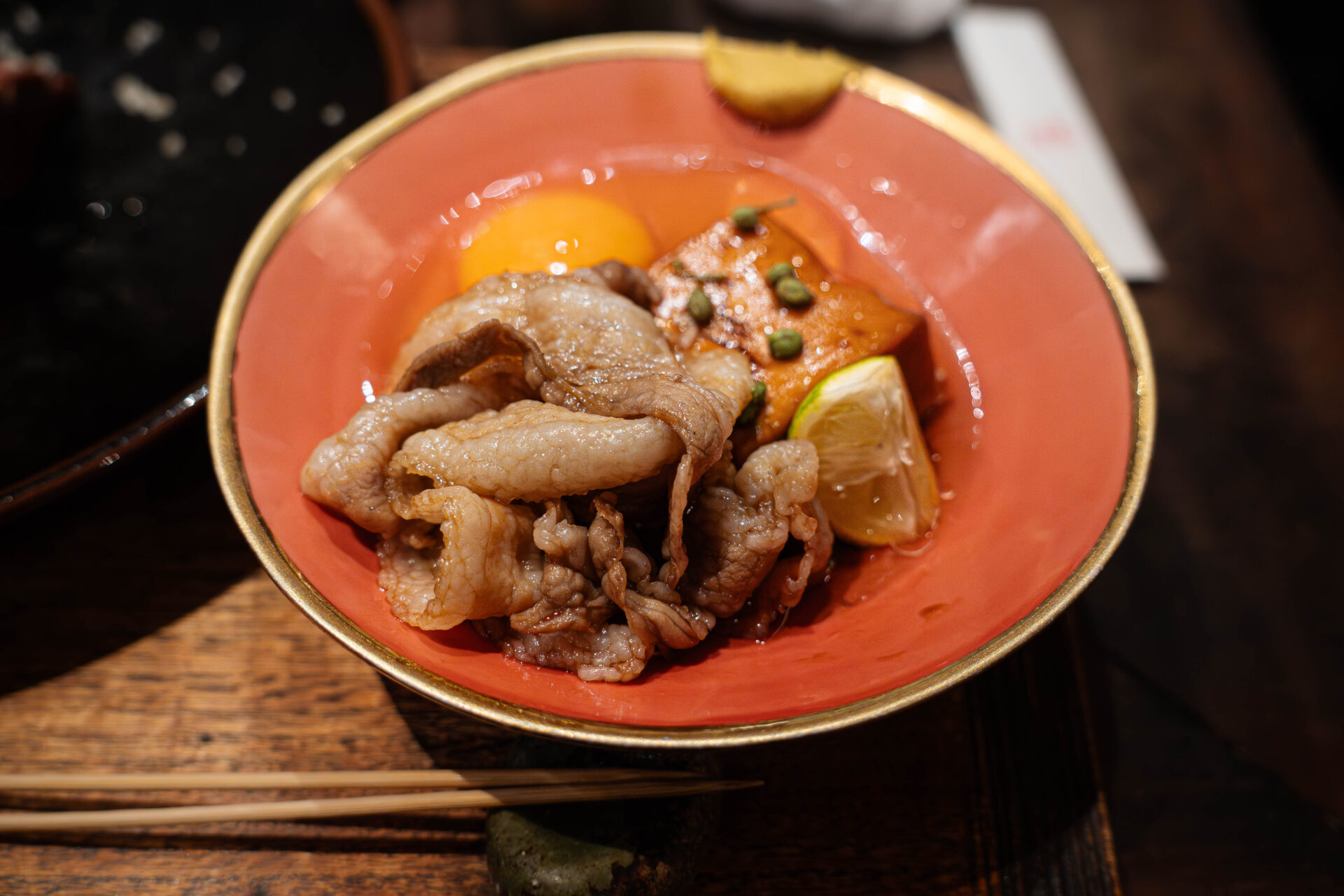 脂がのった黒豚バラはとろけるような柔らかさで、甘辛い割り下をまとった豆腐とともに口に運ぶと、卵黄のまろやかさが全体を包み込みます。